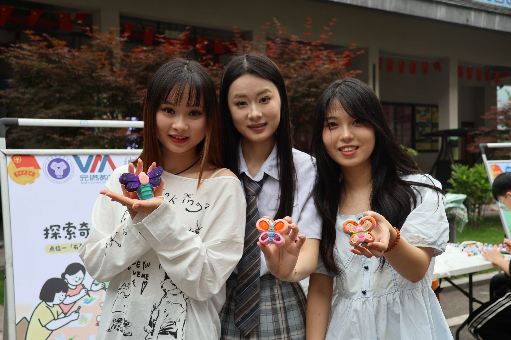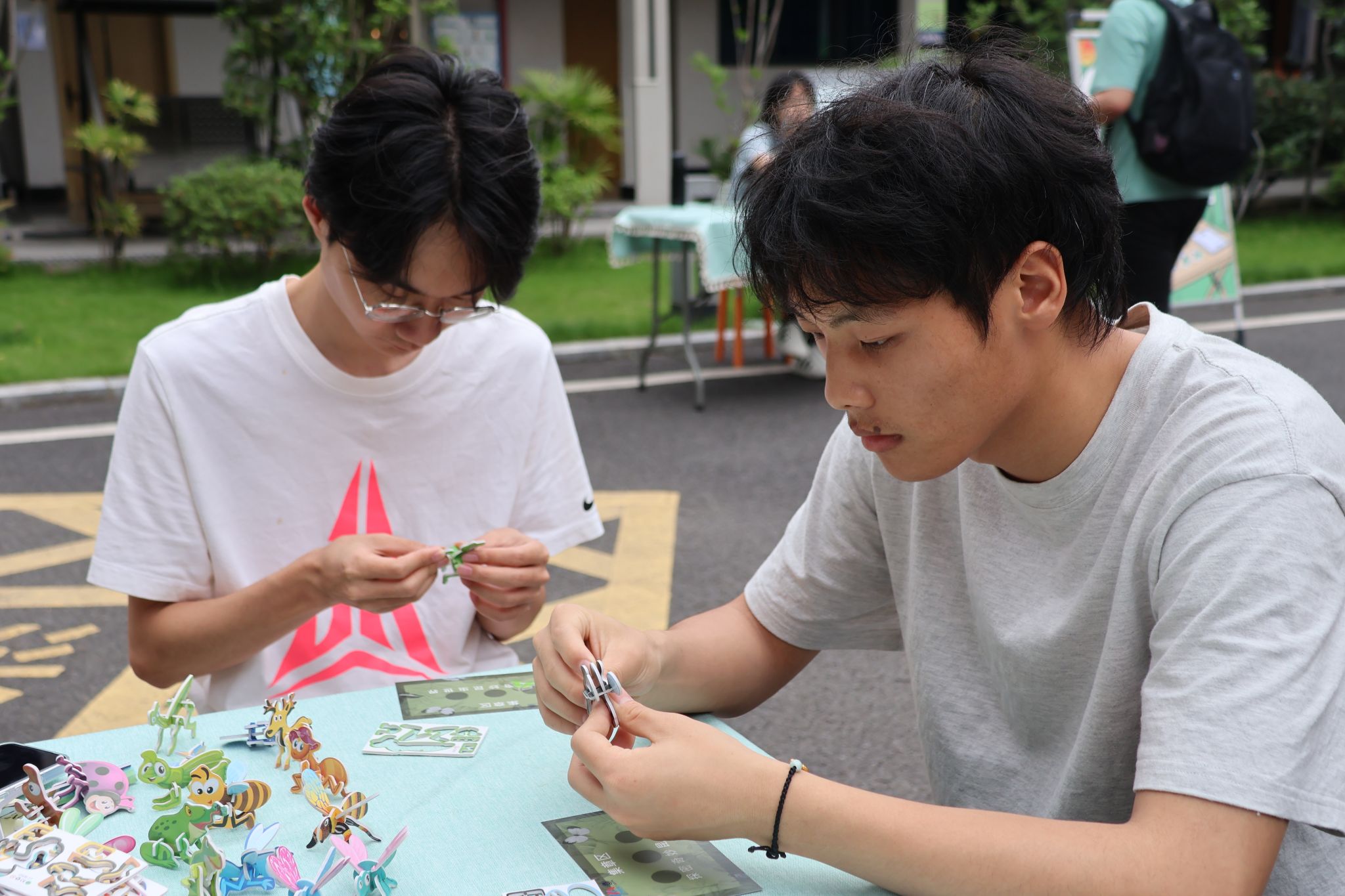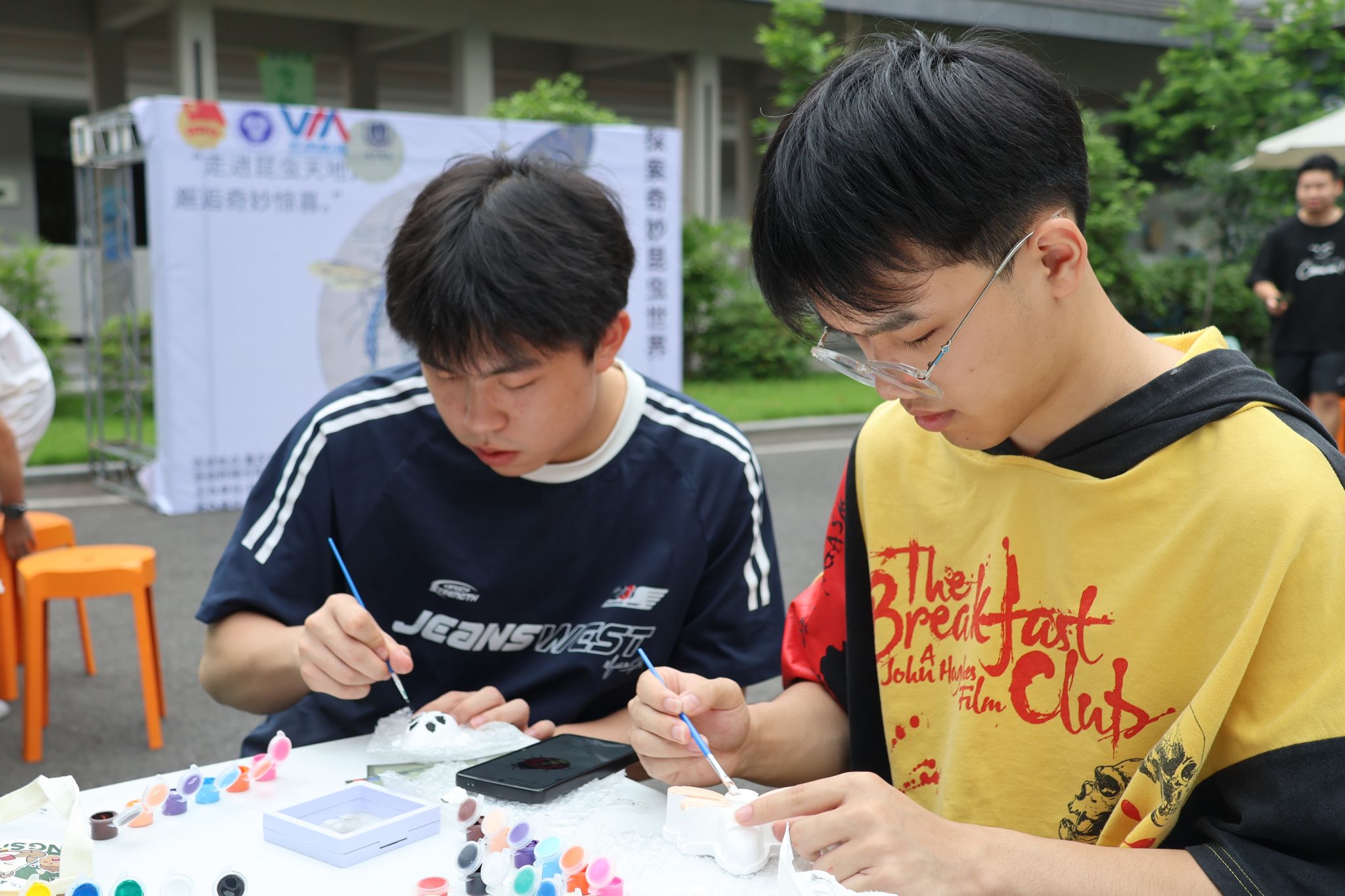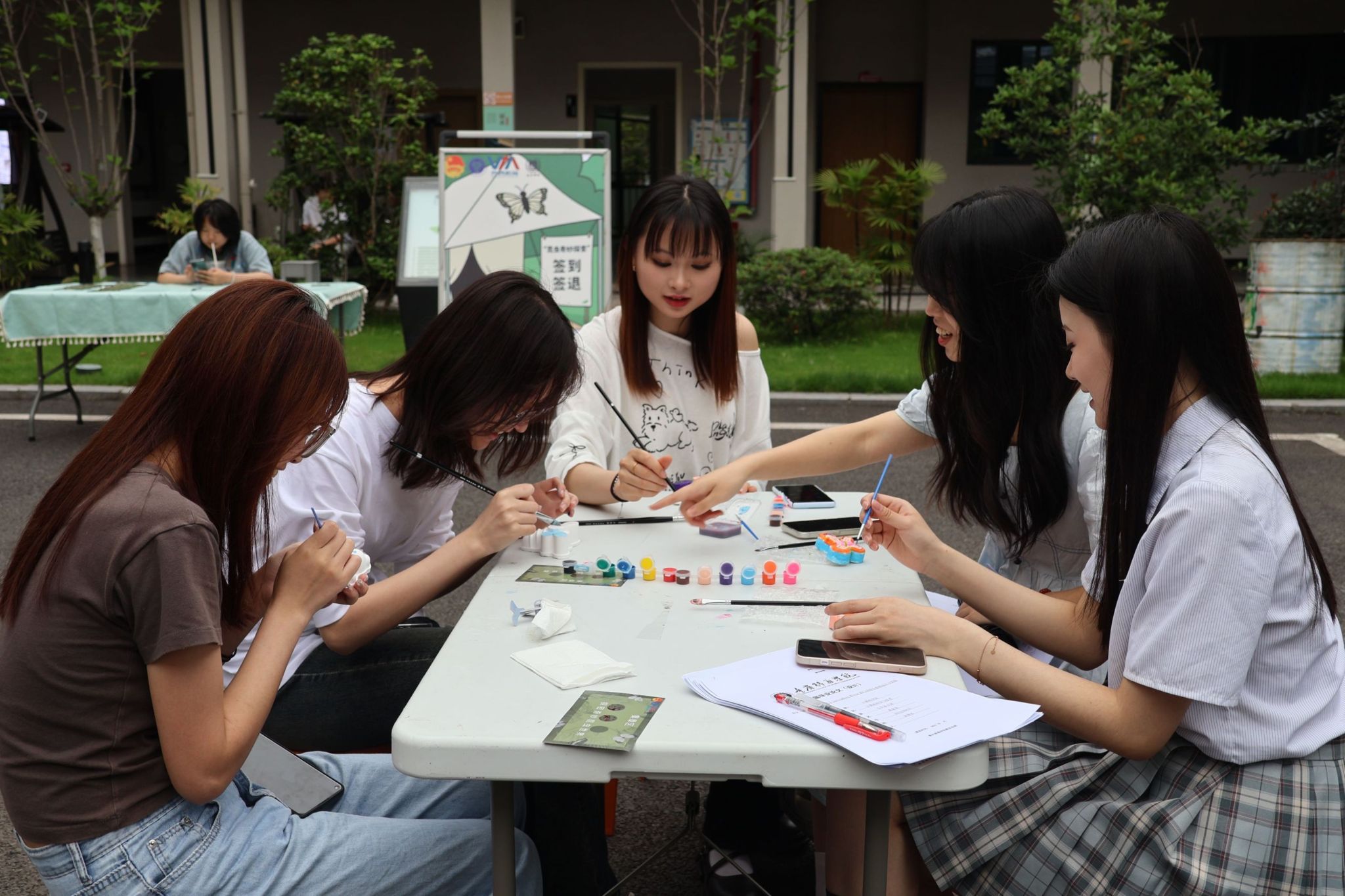在石膏画画的点位中,同学们以白色石膏昆虫模型为基础,挑选搭配自己心仪的颜料颜色,投入创作。活动过程中,大家或参照真实图片细致描绘翅膀纹理,或大胆发挥创意设计个性化配色。现场不时响起交流讨论声,分享绘画技巧与创意灵感。在十几分钟的创作中,一只只色彩绚丽的蝴蝶、造型独特的甲虫等昆虫石膏作品陆续完成。大家拿着完成的作品相互展示,脸上洋溢着笑容,现场氛围热烈。