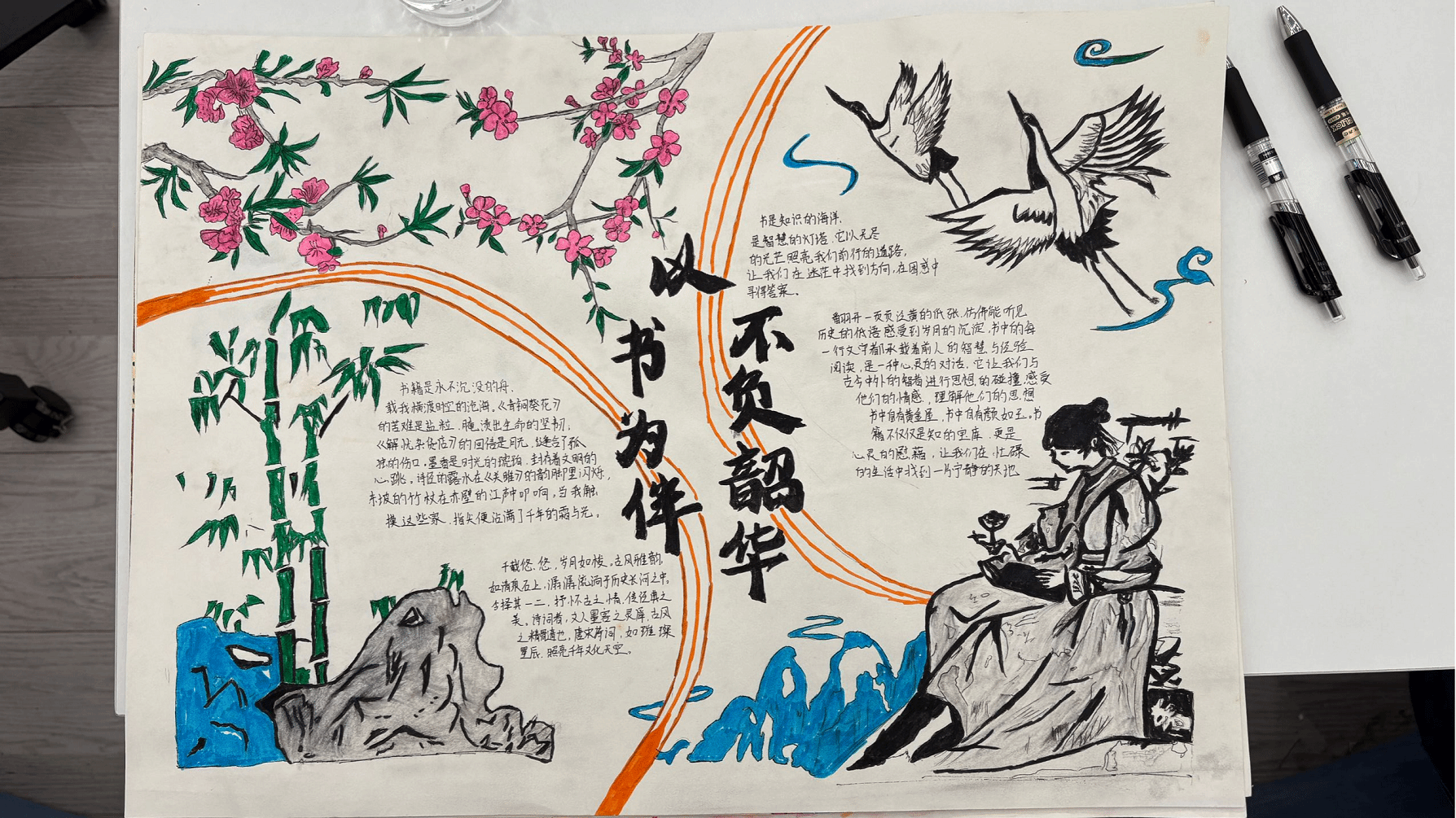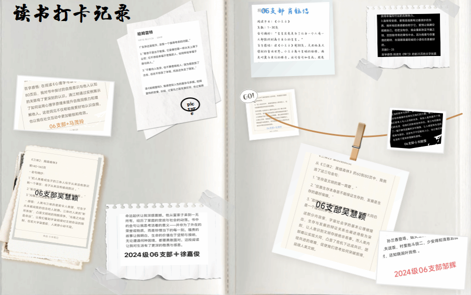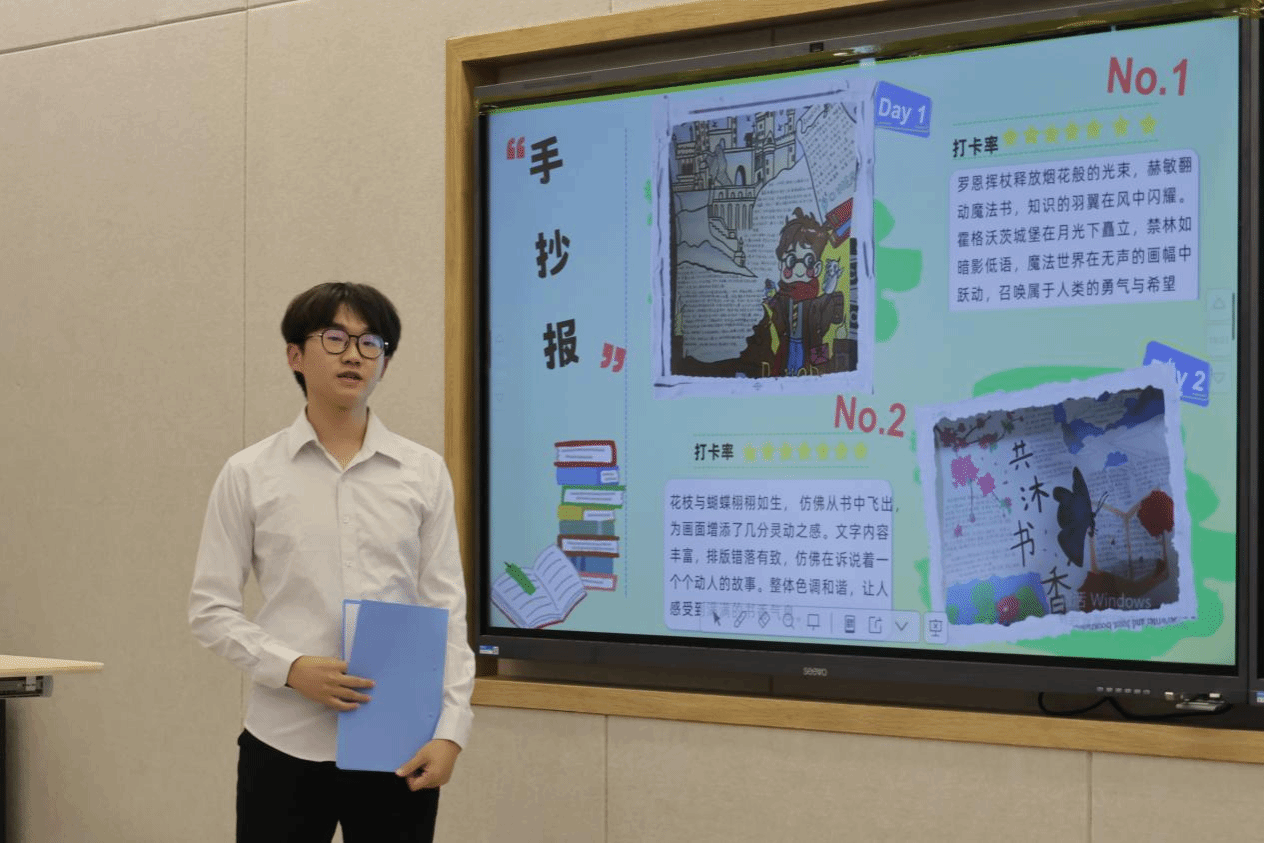 在多维阅读实践中,各支部积极探索,勇于创新,“班级借阅力·冲锋赛”: 以借阅激发学生探索图书馆资源;每日书笺计划:14天阅读打卡,学生每日分享书摘与感悟,深化阅读思考;书评擂台赛:小组撰写深度书评,从文学分析到人性探讨,展现跨学科思维碰撞;手绘书香奇遇:通过手抄报创作,将文字转化为视觉艺术,展现个性化阅读体验。通过不同的艺术形式,将阅读与深度思考相结合,碰撞出激烈的思维火花。