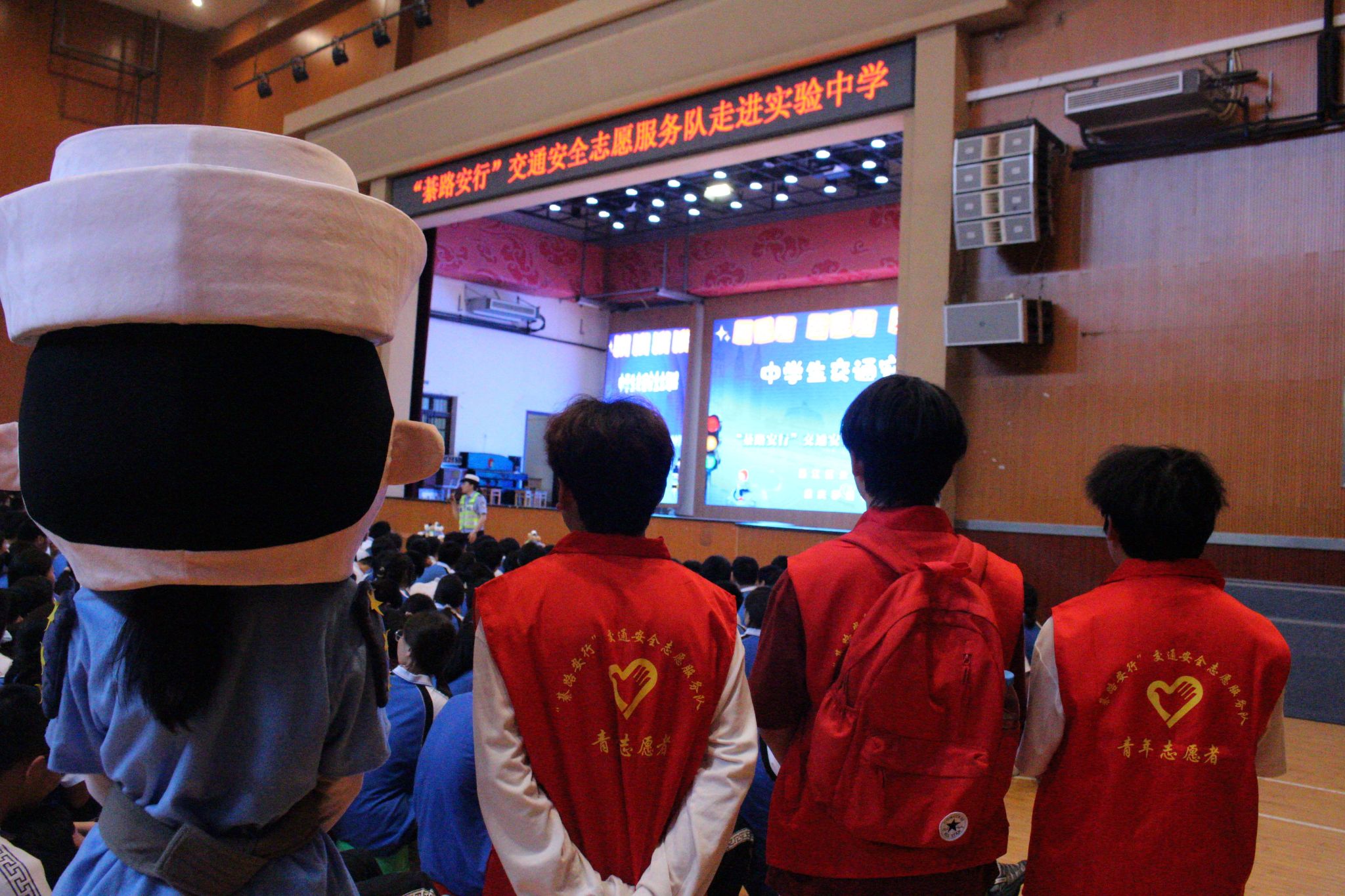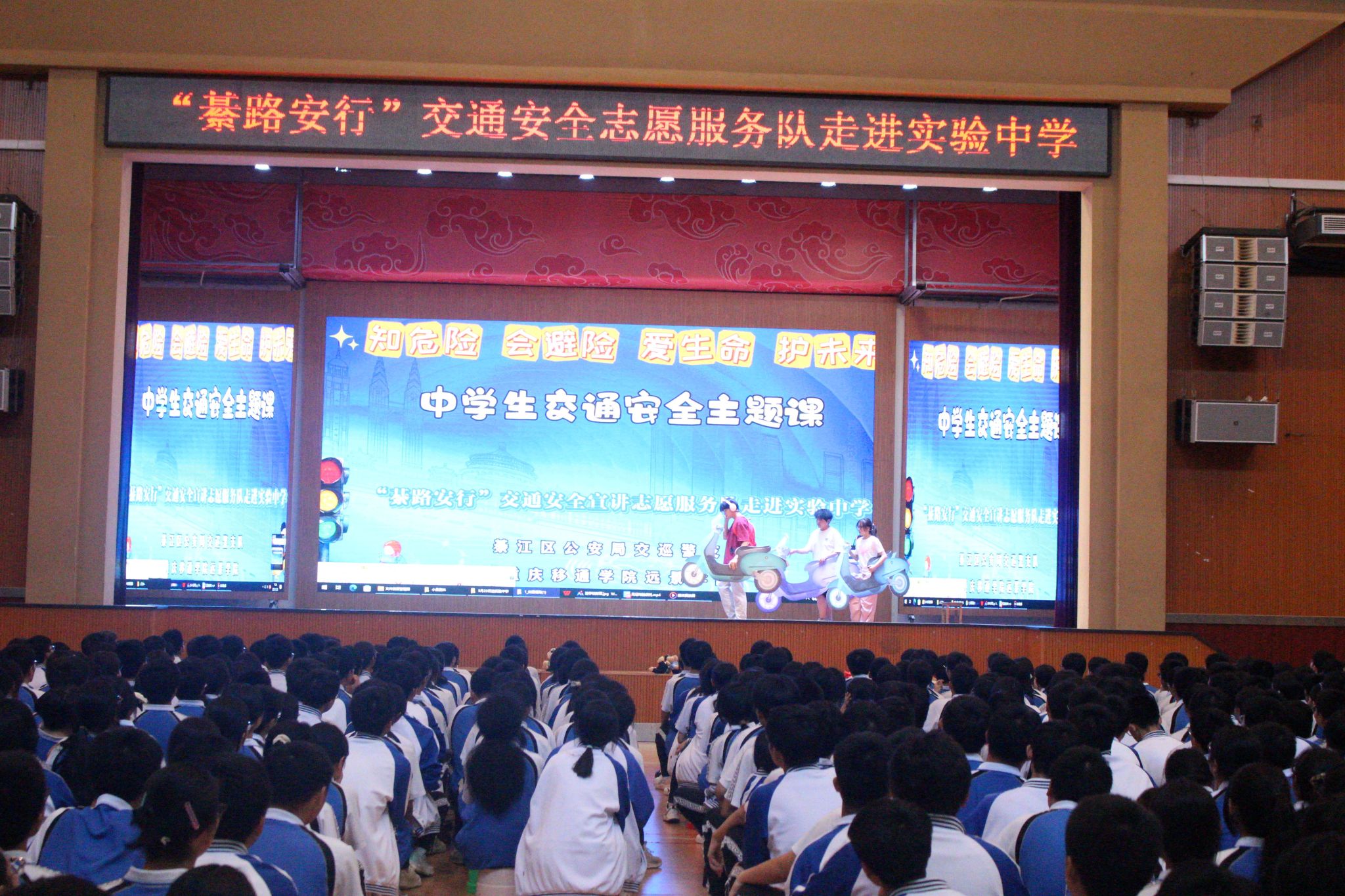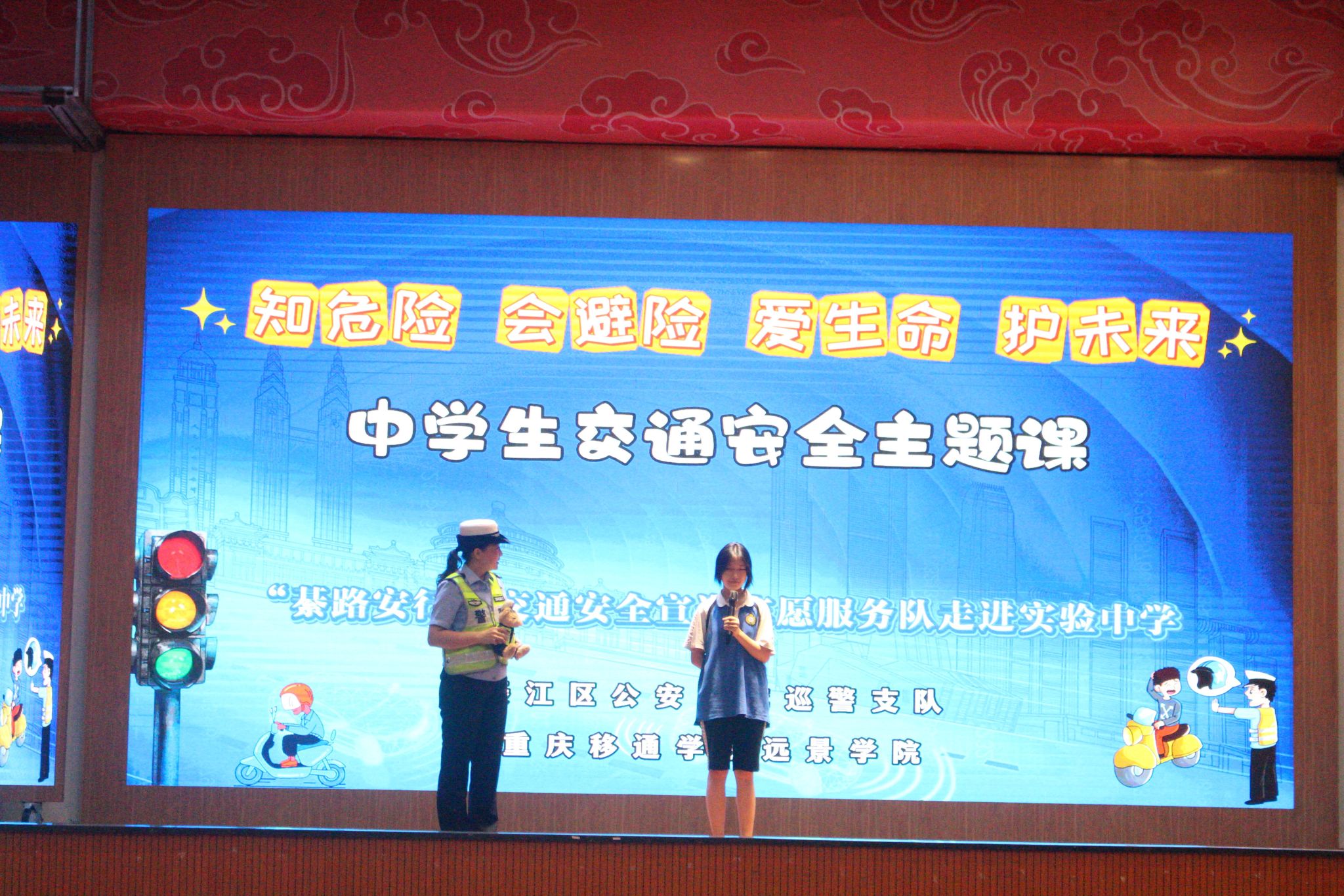 2025 年 5 月 23日重庆移通学院远景学院“綦路安行”交通安全志愿服务队联合綦江区公安局交巡警支队,走进綦江实验中学开展了一场生动有趣的交通安全主题宣传活动。此次与你“童”行,綦路安行主题活动,通过短剧表演、互动、警示片观影等形式,为同学们带来了一堂别开生面的交通安全课。为同学们普及了交通安全知识,提升了中学生风险防范意识,助力构建安全文明的校园环境。