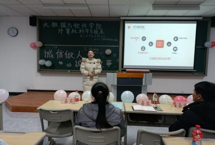 诚信,自古以来就是中华民族的传统美德。为了进一步提高当代大学生的诚信力度,培养当代大学生的诚信精神,让同学们能保持良好的精神状态,提高个人内在修养,展现移通学子的精神风貌,大数据与软件学院计算机科学与技术专业1-8班于12月15日在勇者楼303开展了“诚信做人,诚信做事”主题年级会。计算机科学与技术2班倪文政、唐婷婷担任主持人,特别邀请到淬炼·国际商学院李俊颖老师、辅导员谢沅红老师和班导师汪玥、向春红参与本次年级会。