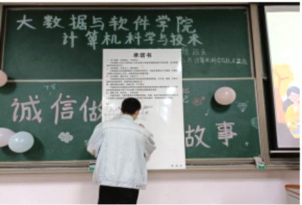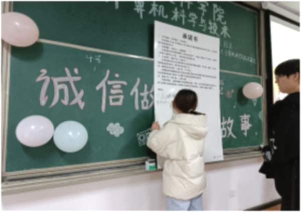 “我宣誓:知行统一,自省自律……”主持人带领全体同学进行了庄严宣誓。志不强者智不达,言不行者行不果。随后同学们来到讲台,郑重地签定诚信承诺书。小小承诺书,真真誓言心,这不仅是对诚信的承诺,还是对自己的负责,更是对人生的态度。通过签定承诺书,大家纷纷表示会严于律己,互相监督,切实落实诚信。