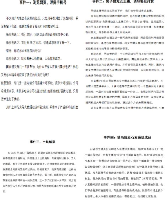 “浏览网页,泄露手机号”“男子冒充主播,诱导粉丝消费”“土坑酸菜”“借高价原石发廉价成品”等都是央视晚会上曝光的事件。为了探究事件发生的原因。本次活动线上组建qq群让同学们畅所欲言,发表自己对某一事件的观点和看法。