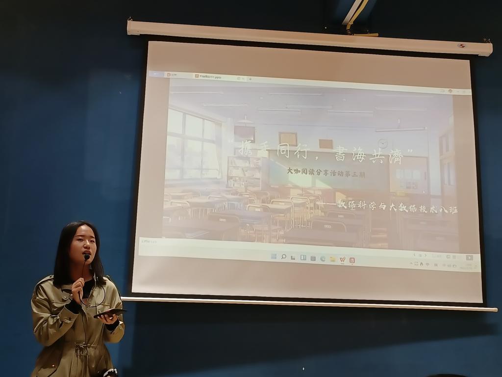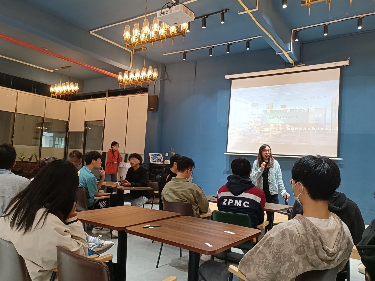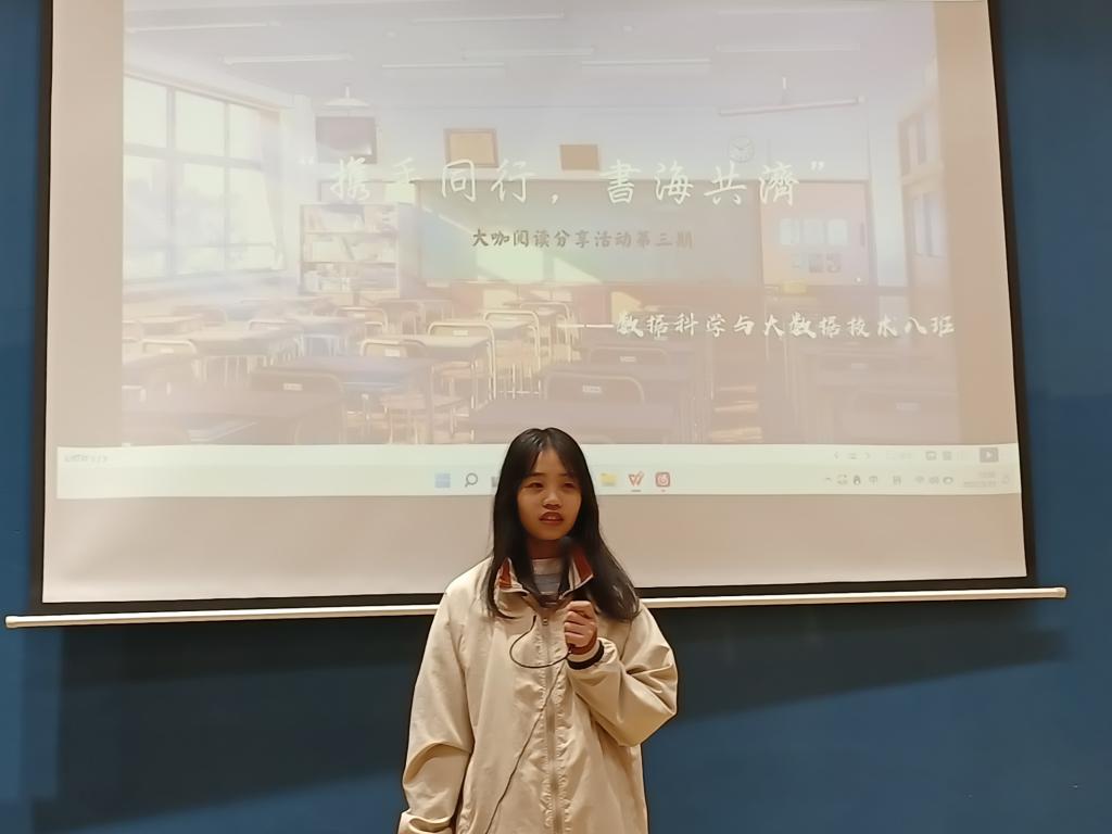 3月25日中午在结束了一周忙碌的课程后,2021级数据科学与大数据技术8班全体同学,在异科导师陈玲老师的带领下于綦河书院东篱故事茶馆迎来了名为“携手同行,书海共济”的读书分享交流活动,该活动积极响应我校“完满校园”的理念,通过“你来比划我来猜”、“你在我心中最美”以及各小组进行“大咖阅读”推荐书籍的阅读分享,让每个同学都积极参与活动,增长了胆量与见识。