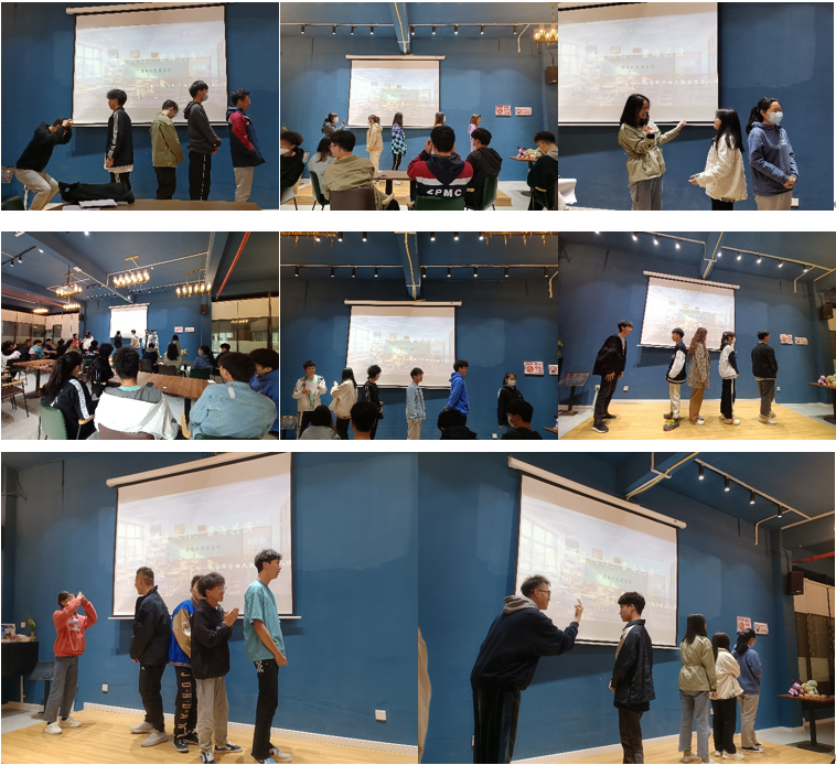 第一个活动是你来比划我来猜,活动以5位同学为单位,由第一位同学看到内容后做出肢体动作来表达文字内容给下一位同学,后面的同学以此类推进行信息传递,直到最后一位同学根据前一位同学的肢体语言传递进行猜词。