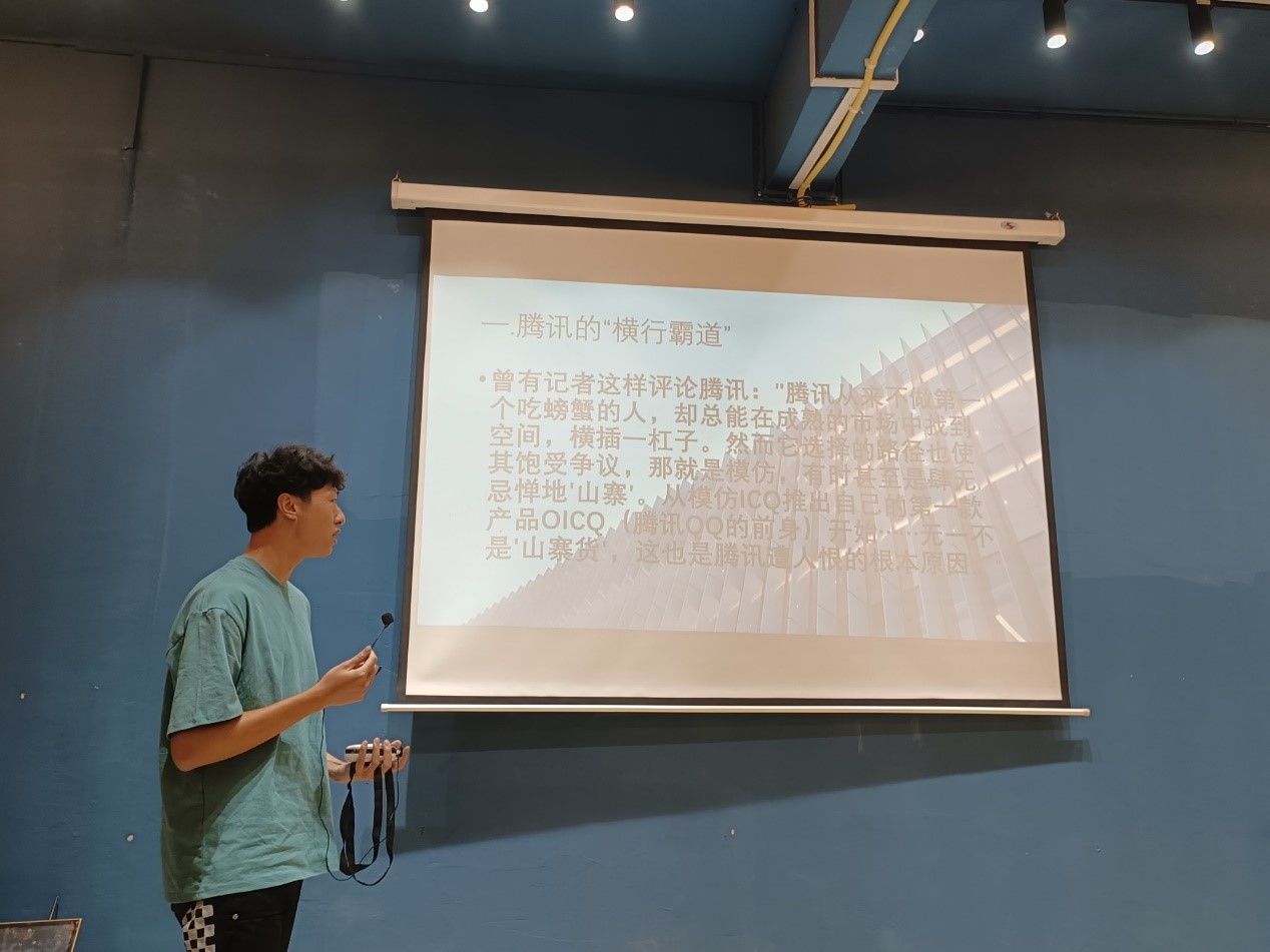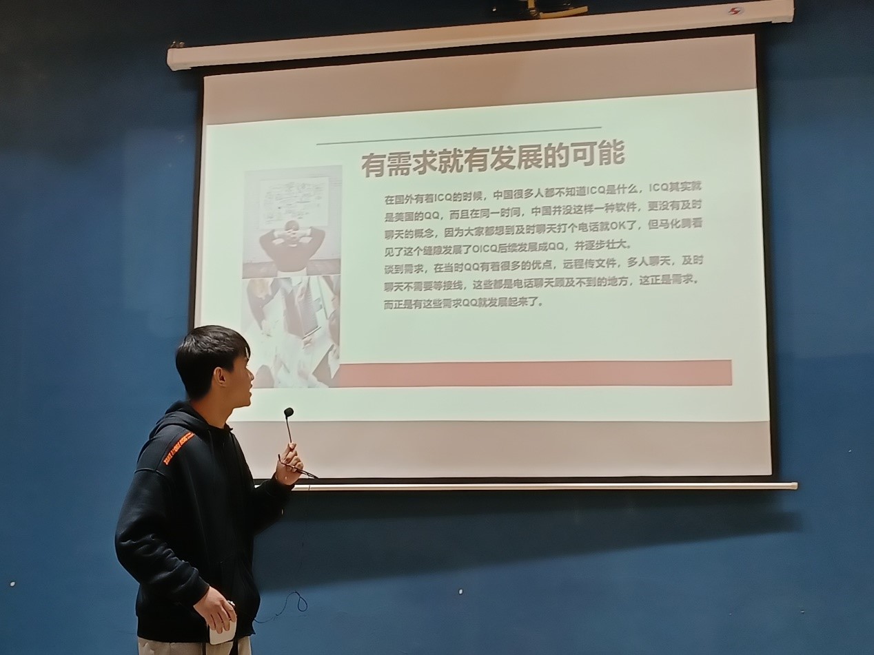 唐浩天同学分享了书籍《马化腾与腾讯》,提出了只要有需求就有发展的可能,“抄袭”更多的不应该是模仿,而是“本土化”,是兼顾本地市场的“改良”,这样才会有需求,才会有发展的可能。