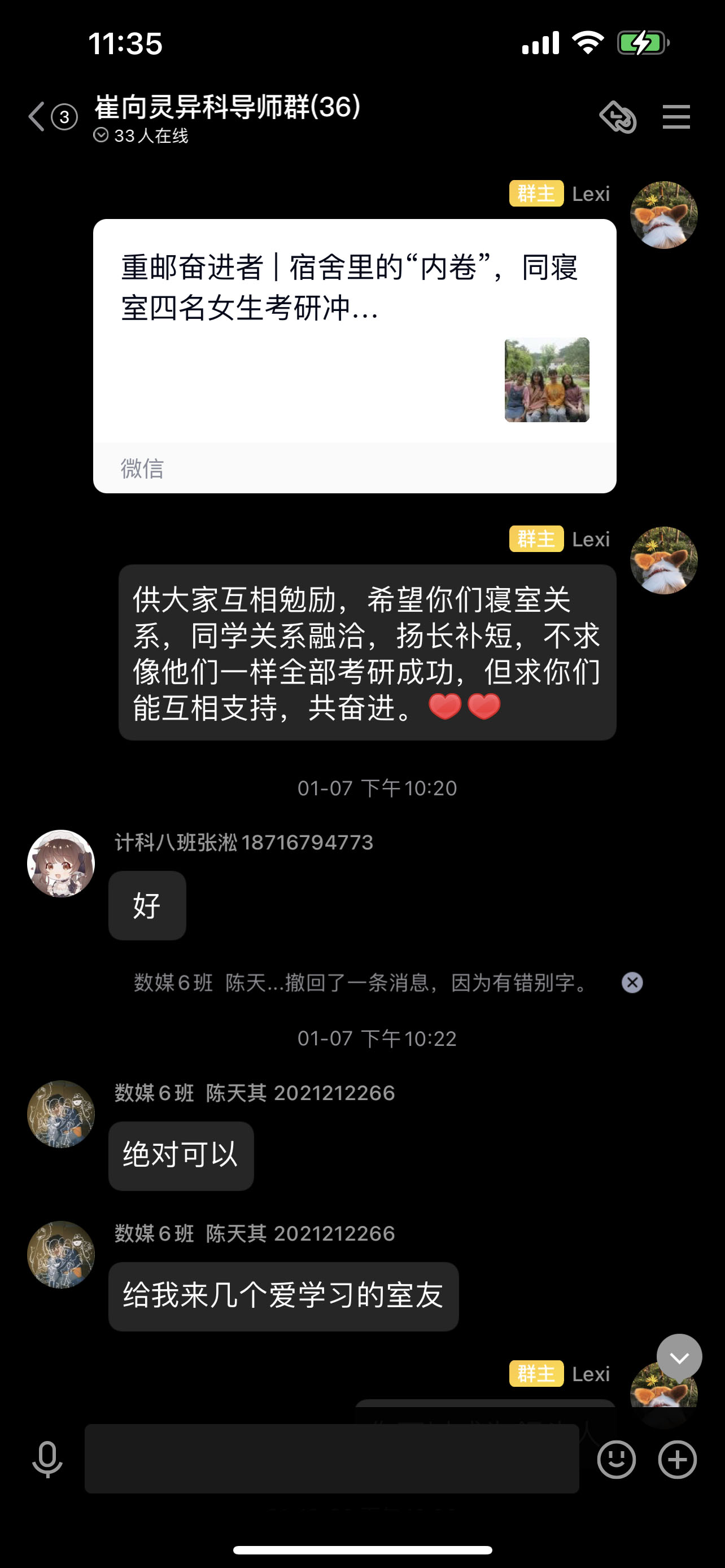 前不久向同学们分享重邮2个寝室共同奋战全部考研上岸的实例,向同学们展示了新时代的大学舍友关系,大学室友,也是可以在学习生活上并肩作战的,共同向着一个目标互相勉励的。要说大学期间对自身影响最大的莫过于同寝室的舍友们了,所以与舍友之间的关系处理也显得尤为重要,良好的人际关系也可以为我们创造一个舒适,的学习环境,从而产生正面积极的影响。