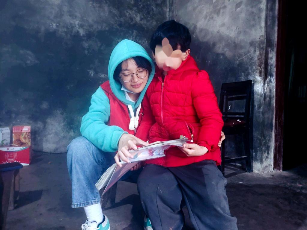 经过了将近一个小时的车程,我们来到了赶水镇土台村,首先走访的是一个正在读一年级的7岁小女孩,她的名字叫蕊蕊(化名)。这是一个非常懂事、乖巧的女孩儿,她的脸上总是挂着甜甜的微笑,笑起来时,嘴角的酒窝也使人很是欢喜。你很难想象这么一个乐观、开朗、活泼的小女孩儿,却是刚刚经历了至亲的离去。我们了解到,在两个月之前,蕊蕊的父亲因病去世,母亲不得不外出打工偿还债务,而外公也为了补贴家用外出打工,家里就只有外婆和85岁的太婆。由于家里的因素,她比其他同龄人甚至是大哥哥大姐姐都要懂事很多,当大多数人在绞尽脑汁想尽理由去向父母多要一点钱的时候,蕊蕊却能明白母亲的挣钱不易,心疼母亲打工的辛苦,即便是一个喜欢已久的书包,她也不曾向母亲说起。可这样懂事乖巧的蕊蕊又何尝不令我们心疼。