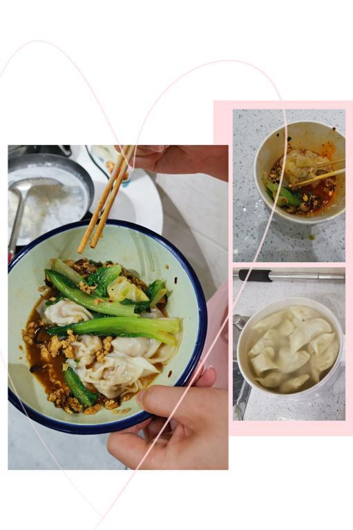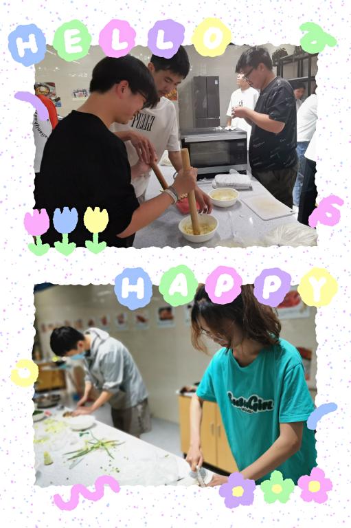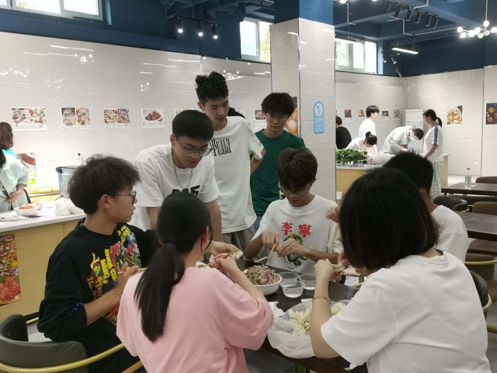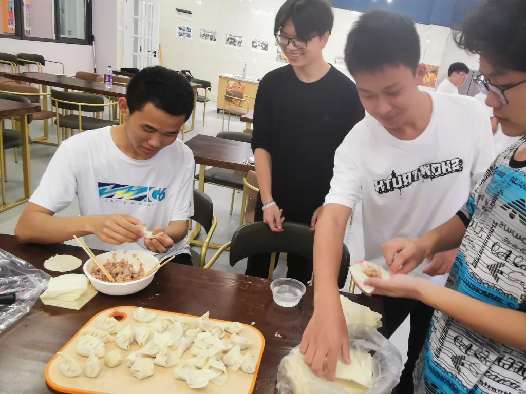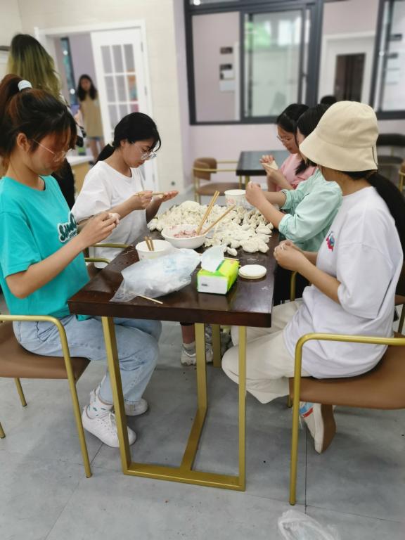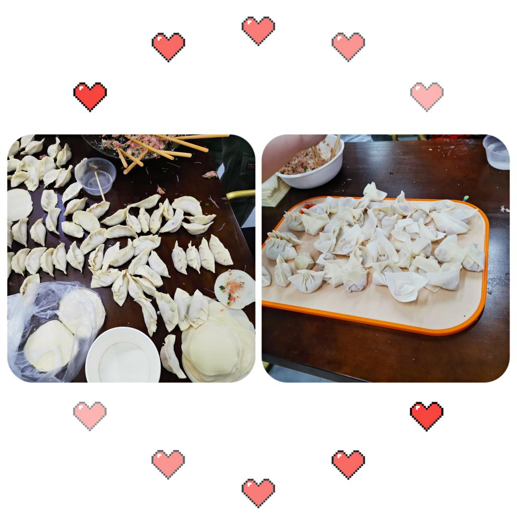 在大家的默契配合下不一会我们就备好了馅料,有胡萝卜粉丝陷、白菜猪肉馅、韭菜猪肉馅和香菇猪肉馅,味蕾随着香气而绽放、让人馋涎欲滴。紧接着我们便开始了包饺子,大家都跃跃欲试,他们各显身手,包的饺子有模有样,造型各异,每个动作都不含糊。但是难免有几个不会的同学,“你不会包吗?没关系我教你,拿点肉馅,皮上沾点水,合上,像这样一捏花边,有了。”热心的唐同学在教不会包饺子的同学们,大家一学便轻轻松松上手了。在制作过程中同学们都积极参与,每个人都切身感受到了大家庭的温暖。现场热闹一片,空气中弥漫着浓浓的饺子香味儿,远处也能听到大家的阵阵欢笑声……