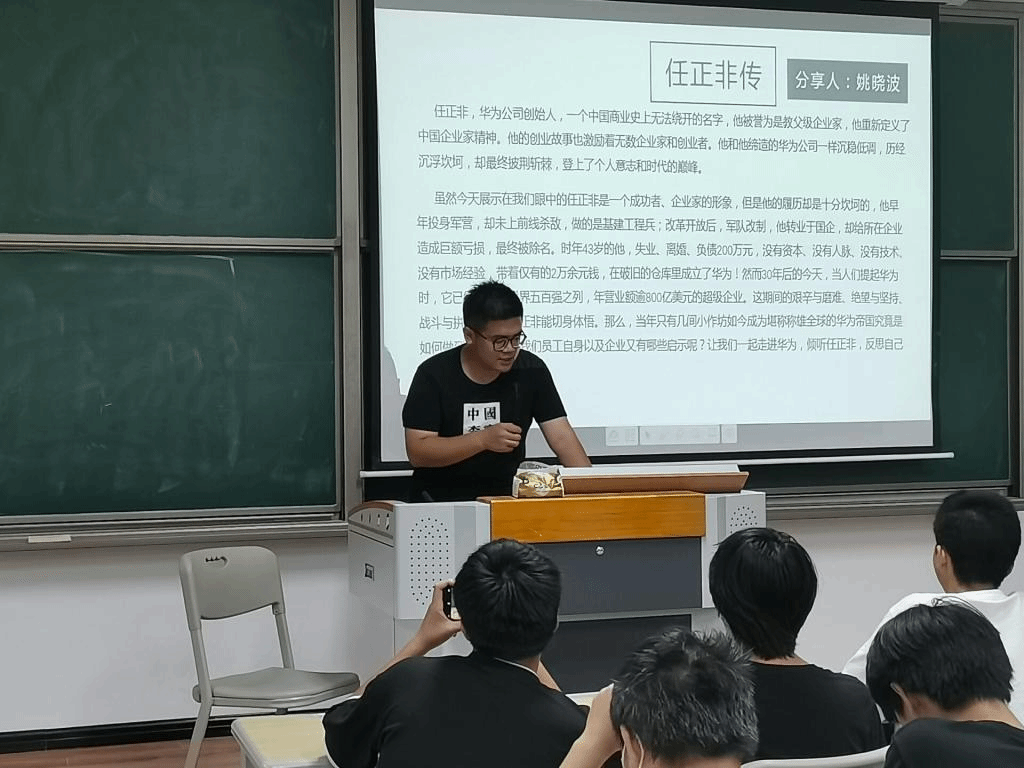 与所创华为的故事。任正非说过:“狼性文化——敏锐的嗅觉、不屈不挠、奋不顾身的进攻精神、群体奋斗。“优质的产品到达香港却显得“水土不服”,任正非培养的“狼”性团队不服输,历经千辛万苦终于在香港取得经营权;面对俄罗斯人对华商品“中国山寨货”的排斥和当地萧条的经济,华为人一一克服,最终华为的势力完全渗透在俄罗斯境内。姚晓波同学在最后还引用到:“实践是水平提高的基础,它充分地检验了不足,只有暴露出来,我们才会有进步。实践再实践,尤其对我们青年学生十分重要。”