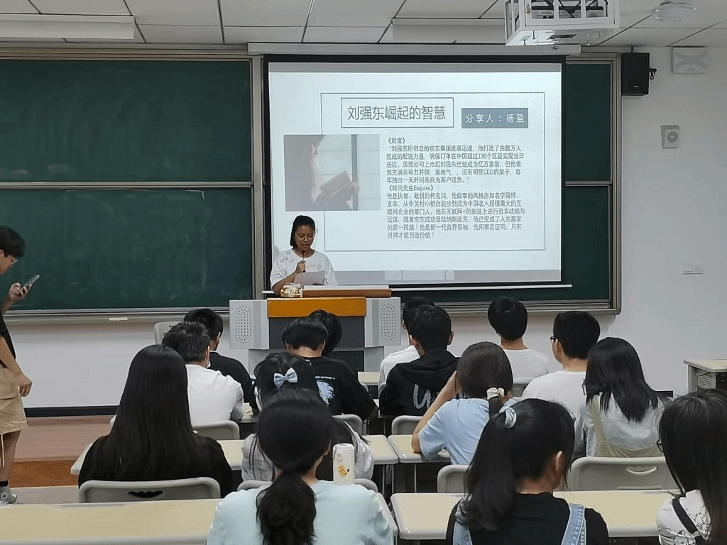 紧接着,杨盈同学对自己所阅读的《刘强东崛起的智慧》进行分享。本书以刘强东的人生经历以及其所创的京东为故事主线,使用直白的方法对京东的成功经验进行了总结,比较容易懂,并对创业投资方面的东西进行了分享。刘强东所创立的京东集团发展迅速。虽然公司上市后刘强东已经成为亿万富翁,但他依然充满亲和力并很‘接地气’,没有明星CEO的架子,甚至每年抽出一天时间亲自为客户送货。” 他是执着、敢拼的代名词,他做事的风格亦如名字强悍、直率。杨盈同学说道:“他是新一代商界领袖,他用事实证明,只有拼搏才能创造价值!是我们学习的榜样!”