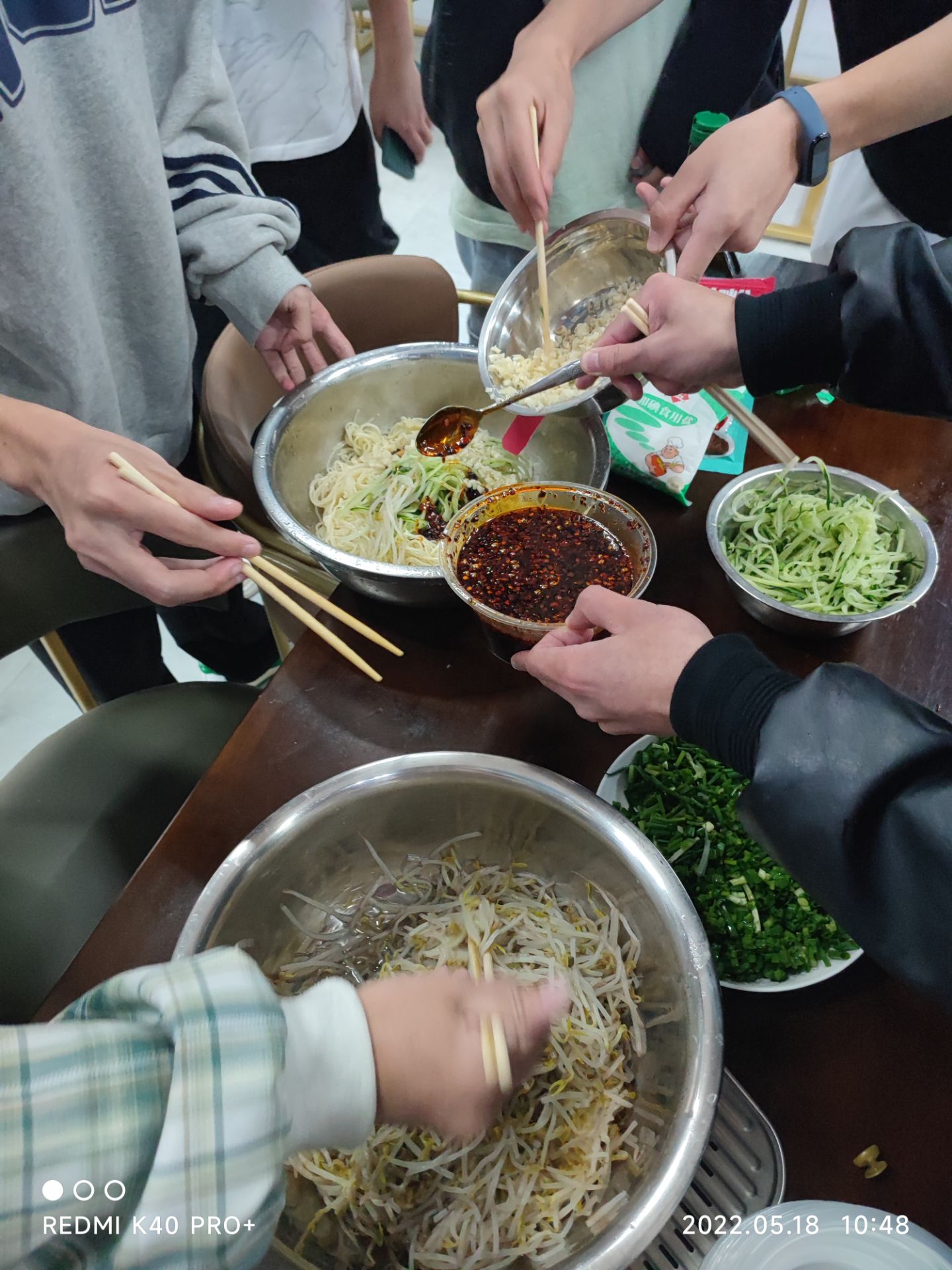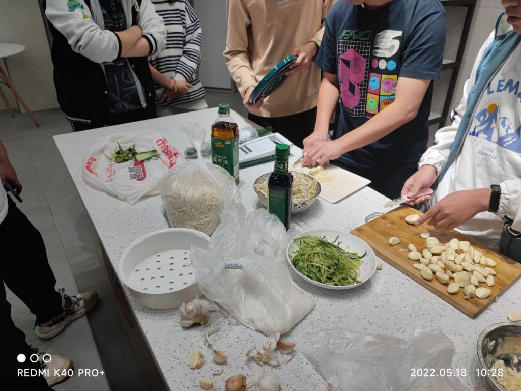 参加的同学都在紧锣密鼓准备相应的食材,咚咚的切菜声,齐刷刷的洗菜声,当然还有拍大蒜和黄瓜的声音......不仅如此,说话声、笑声和欢呼声连成一片,处处洋溢着欢乐的气氛,让大家在紧张繁忙的学习生活中度过一段轻松,愉快的周三。