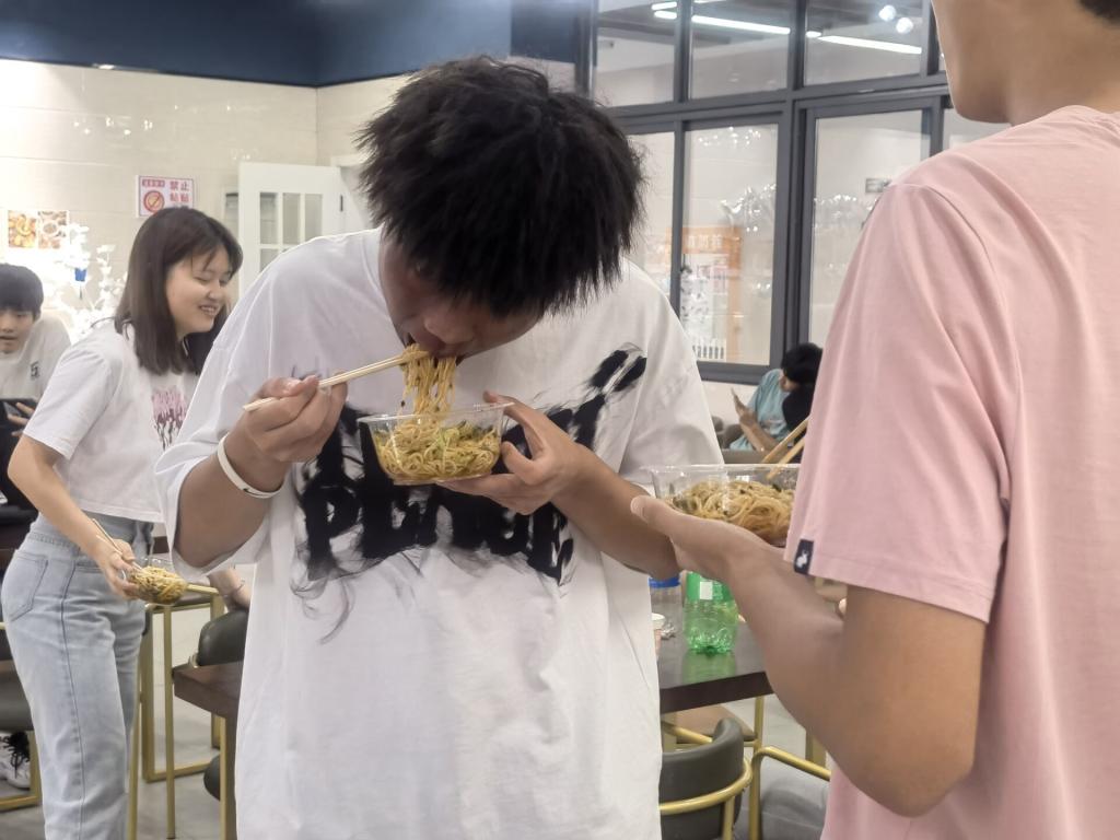活动现场,晓蝶老师分配完工作之后,本次活动立刻进入了紧张有序的状态,每个小组分工合作,切菜,摆盘,洗豆芽......每个人都开始着手自己的工作,一盘盘配料和面条在同学们的手中传递,通过相互合作,不一会美味诱人的凉面就摆放在桌子上了,每个人做的面条都有自己独特的名字,并且蕴含了特殊的含义,比如,漠漠水田飞白鹭,蒸蒸日上......在我们开始最后开始品尝成果的时候,同学们争着,跑着,喊着,吃着,评着,乐着,活动在欢声笑语中进入了高潮,赵文杰同学甚至还做了炒面、小面,不止于凉面这一主题的束缚。