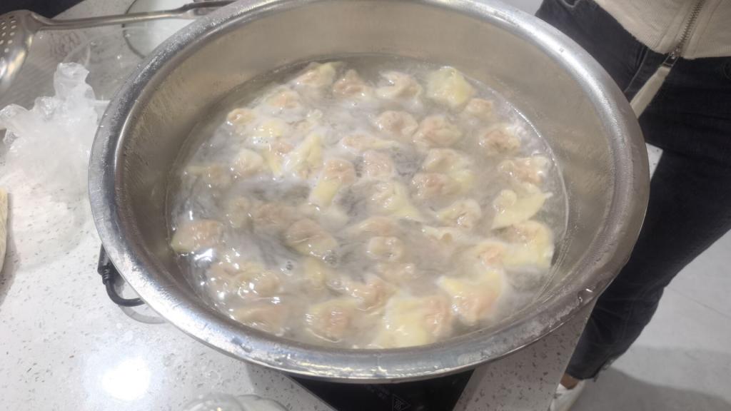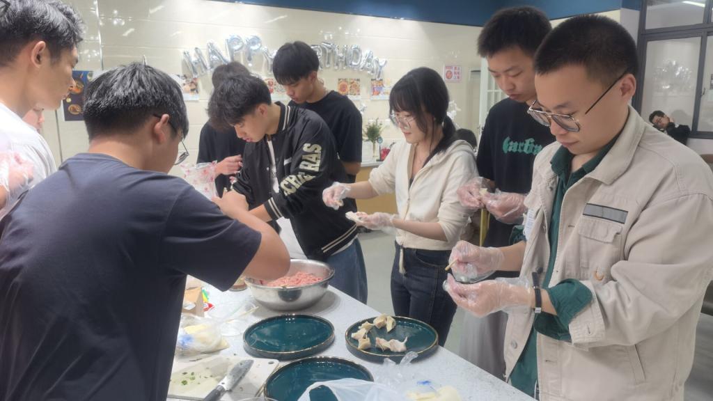 除了凉面的制作,俊颖老师还带领着同学们包饺子,将准备好的面皮、肉馅放置在案板上,同时为学生们提供了和肉馅的技术指导,接下来大家分工协作,动作娴熟,有条不紊,纷纷使出看家本领,活动现场欢声笑语,热闹非凡,大家忙得不亦乐乎,经过一个小时的努力,包出了一排排独具特色的饺子,有大有小、有圆有扁,月牙饺、元宝饺等造型相继出现。有的同学是第一次包饺子,虽然动作略显笨拙,但包出的饺子还是有模有样!