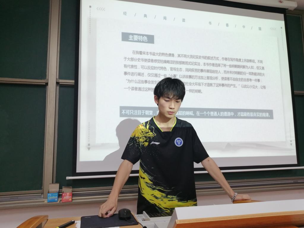 在这次读书分享交流活动中,同学们踊跃报名、积极参与,呈现出自信自强的主流群像。五班的同学分享了《显微镜下的大明》,将马伯庸的个人特点总结为博、趣、奇,从六个深藏于故纸堆中的明代基层政治事件中进行推导,以小见大,让每一个读者透过这种特殊视角去发现一个不一样的明朝。
