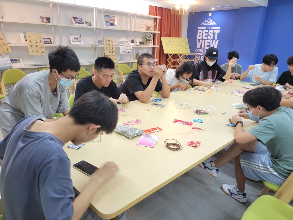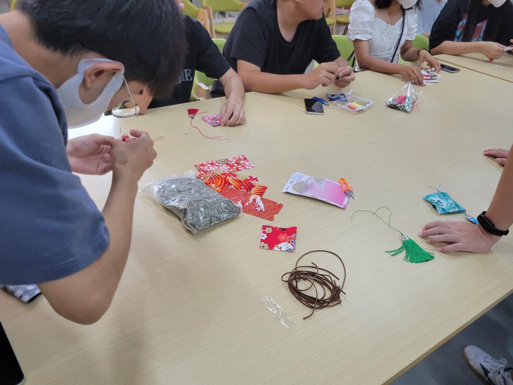 大家早早做足功课,桌子上的小珠子、彩绳、针线、挂饰配件等材料一应俱全,同学们挑选自己喜欢的材料现场感受手工制作之美。香囊的制作大致分解成若干个步骤,大家一步一步的制作香囊,通过裁剪、填充、缝合、收口、装饰等步骤把自己的祝福倾注在一针一线里。