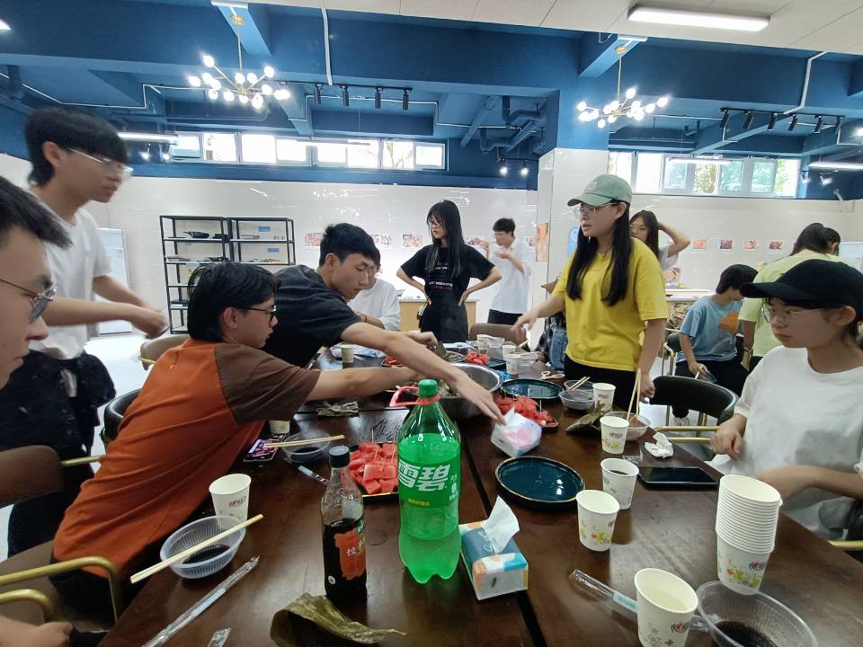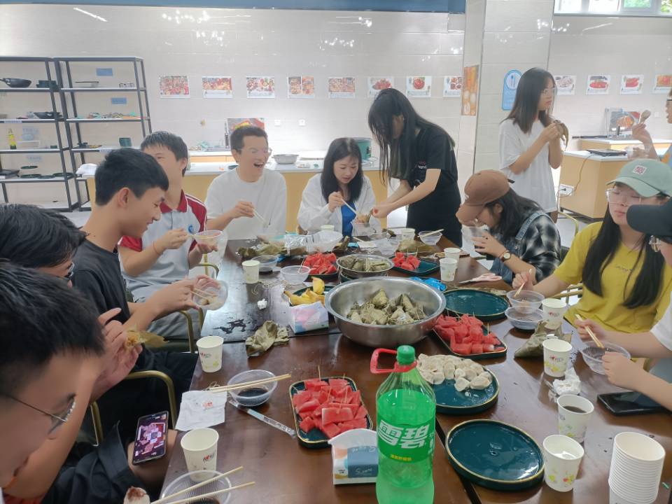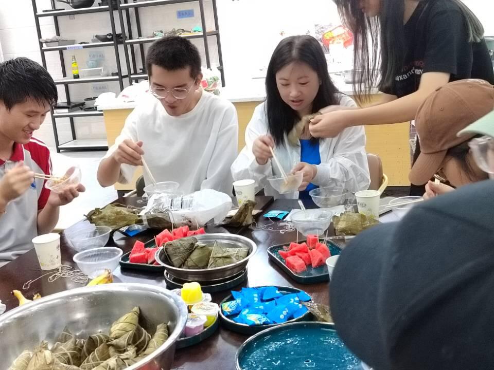 粽子是传递美好的信物,同学们和萧婷婷老师一起享受来自端午节的美好,粽子出锅后,同学不禁惊叹熟粽的来之不易,迫不及待挑选自己喜爱的粽子味道,据不完全统计,同学们对于甜粽与咸粽的热爱,咸粽要略胜于甜粽一些。餐桌上大家有说有笑的,交流甚欢。
