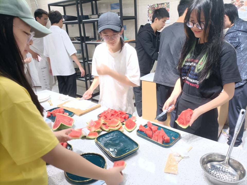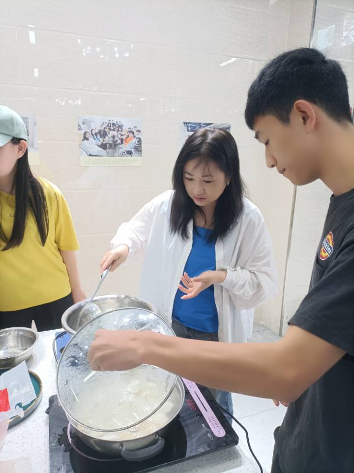 起初,同学们认为煮粽子与饺子是最简单的事了,认为粽子下锅煮就一定能很快煮熟,便自顾自的做其他事了,然而煮了很长时间,都没有动静,直到萧婷婷老师掀锅一瞧,才发现事出有因,原来是水放太多了,这样会煮很久都不见起色。这才让同学们大悟,原来煮粽子与饺子也是需要技巧的,萧婷婷老师耐心为同学们讲解煮速冻粽子与水饺的方法,同学们听后都纷纷表示受用万分。此后同学们就各自的问题,与萧婷婷老师进行了愉快的交流,从中也倍感收获。