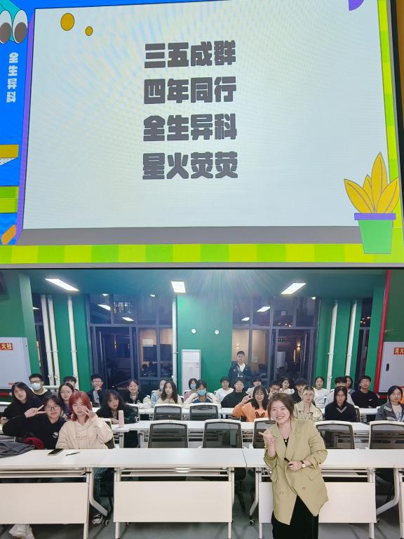 见面会的最后,杜老师送给同学们一句话——“三五成群,四年同行,全生异科,星火荧荧。”杜老师说到:“三五成群”指的是我们班35个同学;“四年同行”意味着未来四年,我们将结伴前进;“全生异科”是我们的项目名称;“星火荧荧”是希望大家都能发光发热,聚似一团火,散似满天星。这是我们异科班的slogan,是对全生异科制的诠释,也是对同学们的美好期望。