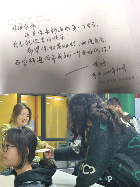 见面会接近尾声,惊喜却没有停止。杜老师拿出两张手写贺卡,告诉同学们十月是班上黄思琪和陈德凯同学的生日月,随后一起向他们送上生日的祝福。手写的贺卡,真挚的祝愿,异科班的爱意在这一刻凝聚。