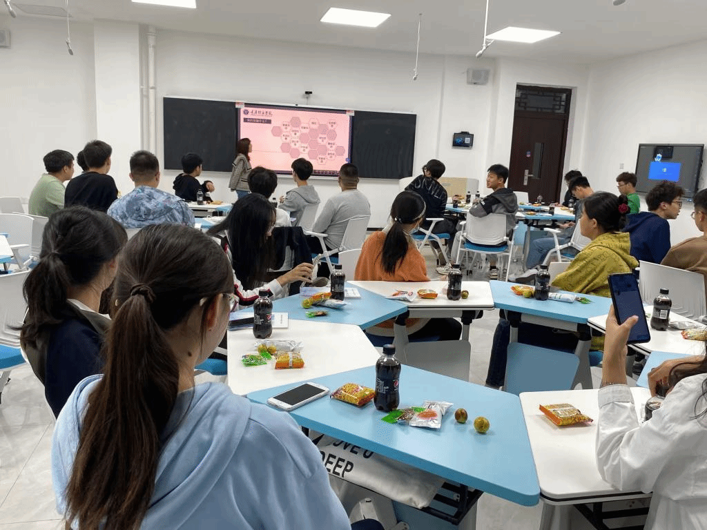 在异科导师班见面会开始前,大家围坐在八边形的蓝白桌前,互相分享零食,虽然第一次见面,但也没有感到陌生,气氛和谐温馨。