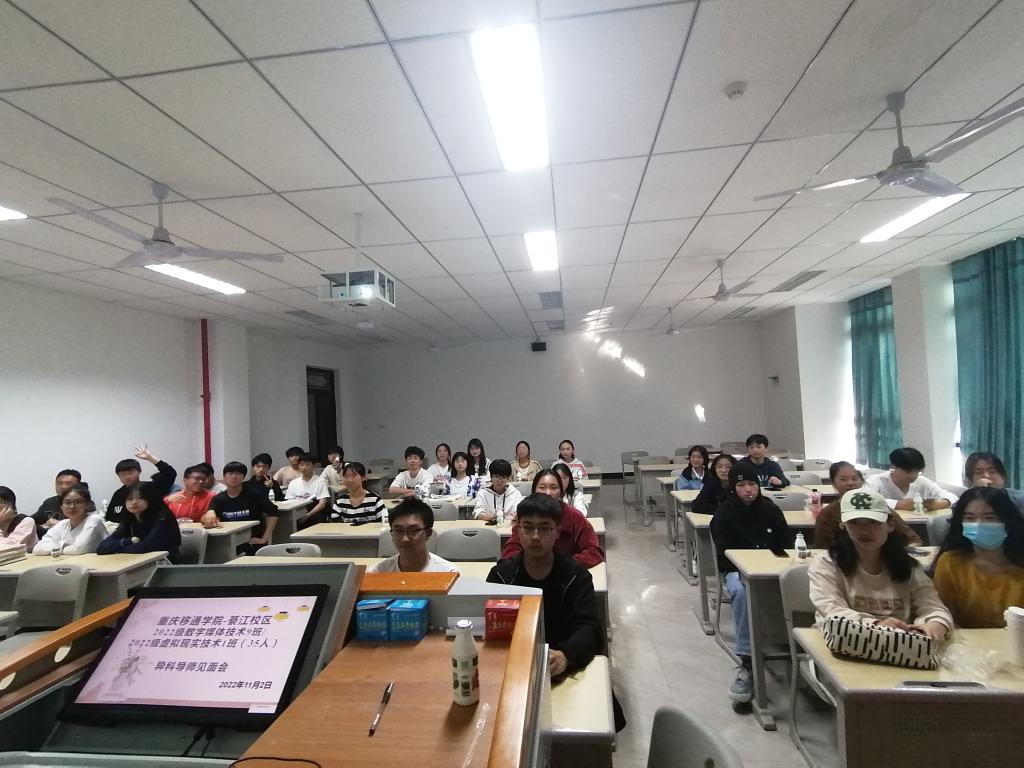 2022年11月2日星期三下午3点40分,异科导师王小娟与大数据与计算机科学学院2022级数字媒体技术9班以及虚拟现实技术1班的35名同学在仁者楼309教室进行了第一次“全生异科”师生见面会。