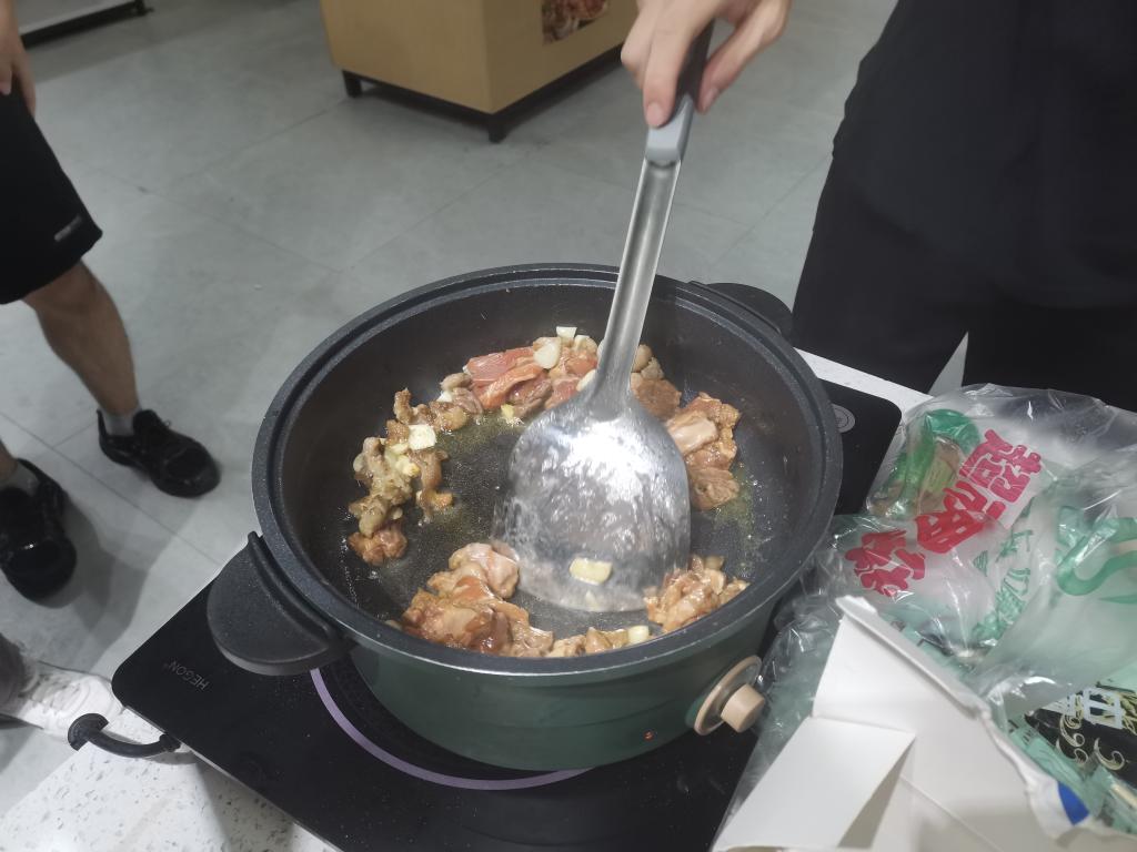 首先,李稼薪和刘扬同学为我们生动有趣的讲解了一道家乡菜——北方大烩菜,首先处理好所有的配菜,其次把油加热,油热后下入葱花、八角、干辣椒段炒香,接着处理所有配菜,最后加入适量盐、老抽、生抽调味,盖上锅盖炖煮10分钟。加入适量水淀粉勾芡,大火把汤汁收黏稠,让汤汁紧紧地包裹在食材表面即即可。其他同学们也积极做着备菜的系列工作,在劳动中增进彼此间的友谊。
