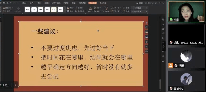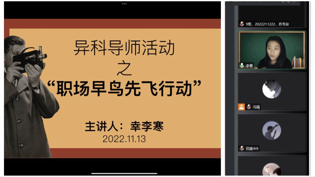 2022年11月13日晚上,在这疫情肆虐的情况下,大数据与计算机科学学院2022级异科导师幸李寒老师与计算机科学与技术9班全体同学于腾讯会议进行了线上会议。幸李寒导师以“职场早鸟先飞行动”为主题,对如何写出精简简历、完善面试技巧等内容,为同学们做出详细讲解,并献出自己宝贵的经验,同时也希望,在未来的面试中,能够帮助学子添加一抹光彩,面试更为自信!