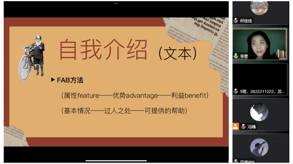自我介绍是最重要的一部分,有人能够在面试中侃侃而谈,有人却断断续续,最为面试失分,故而导师针对于此,面容自信,脱口而出。“完满教育”是为我校一大优势,在教育过程中,有许许多多的社团,组织面试,极大的提高了学生这方面的能力成长,继而介绍了FAB分析法,学生也是豁然开朗,醒悟甚多。