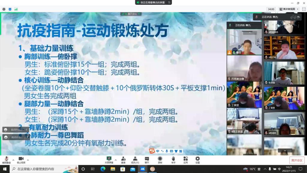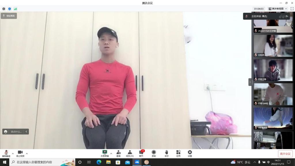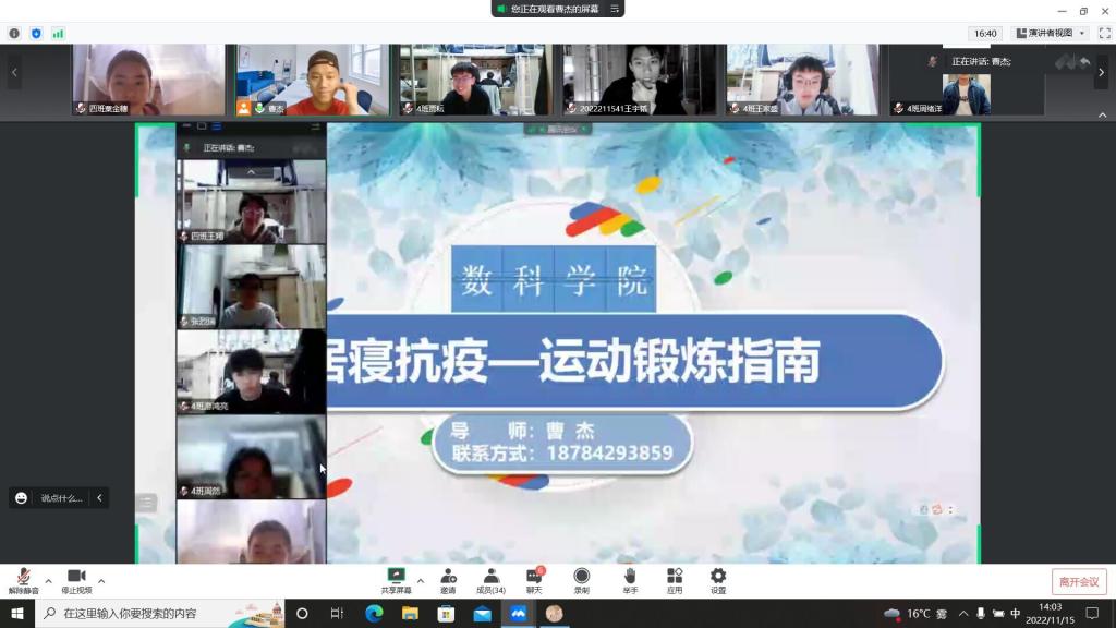 美好的时光不该因疫情而黯淡。封控不封心,在隔离生活中,你想丰富一下课余生活吗?2022年11月15日星期二下午2点大数据与计算机科学学院异科导师曹老师与数据科学与大数据技术专业4班的35名同学进行了居寝抗疫——运动锻炼指南的线上活动。本次活动由曹老师主持,数据科学与大数据技术专业3班、4班的35名同学全体同学参与,旨在给封控在寝室的同学们分享防疫小常识和锻炼指南。