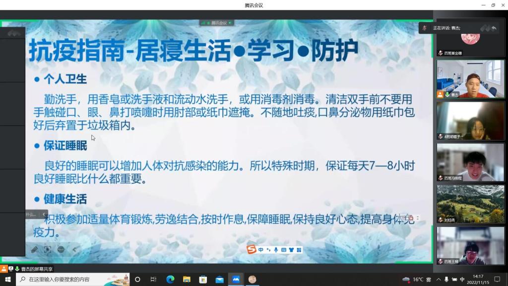 科学防疫,从我做起。接着曹老师从个人卫生、保证睡眠、健康生活三个方面向各位同学分享了疫情封控期间居寝生活、学习、防护的小指南,并结合《新型冠状病毒肺炎防控方案-第八版》、《公民防疫基本行为准则》给各位同学了总结了防疫妙招11条,干货满满。
