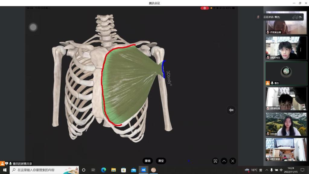 科学运动,理论先行。然后,曹老师从运动解剖学的角度为同学们讲解了胸大肌的构成部分,接着从基础力量训练和有氧耐力训练两个方面为同学们陈列了居寝运动锻炼的处方,曹老师为同学们演示了正确标准的俯卧撑要领后让同学开始在寝室按照训练计划进行运动锻炼。