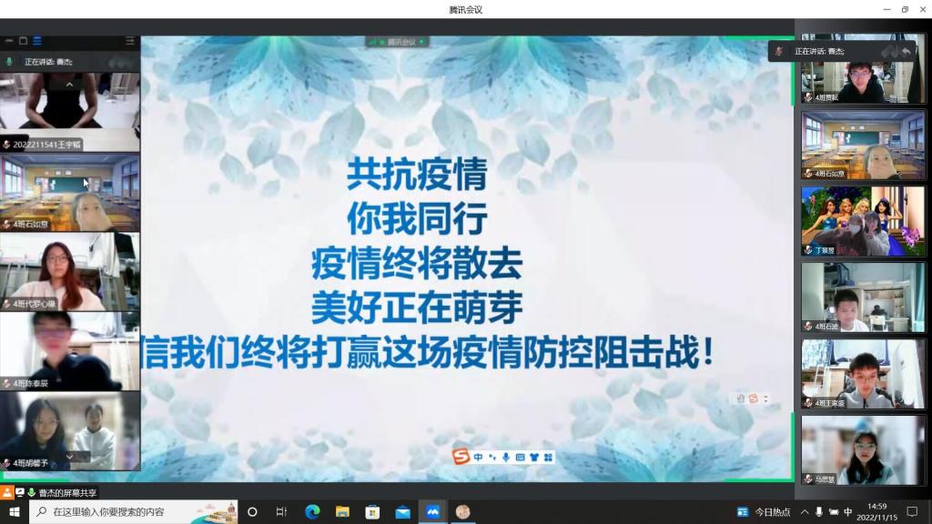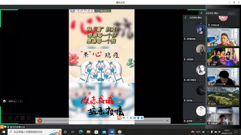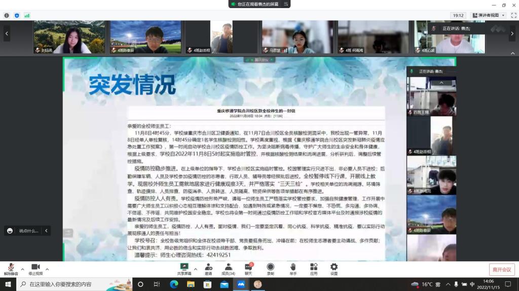 “合”你一“綦”,同心抗疫。首先曹老师向同学们简要的介绍了重庆移通学院合川校区、綦江校区的疫情发展过程,解读了《重庆移通学院合川校区致全校师生的一封信》和《重庆移通学院綦江校区“11.12”疫情应急处置1号通告》,分享了双校区志愿者老师在抗疫过程中的点点滴滴,艰苦卓绝。同学们纷纷表示志愿者老师们辛苦了,并以身作则,坚决遵守疫情防控相关要求,稳住大后方。