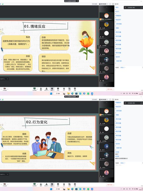 为了减轻疫情可能导致的心理伤害,做到及早预防、及时疏导、有效干预。为预防病毒感染校园实行封控管理,容易给部分学生带来焦虑情绪,控制不住地看各类有关疫情的信息,担心家人、朋友或自己染上病毒。恐慌焦虑的情绪还会影响生理状态,如出现头晕、恶心、胸闷、寝食难安等消化道和呼吸道症状,林红老师讲解了疫情期间有可能的知、情、意、行改变,并对同学们提出的问题一一讲解,引导同学们战胜心理恐慌。良好的情绪状态是疫情的免疫力,居寝学习期间,使同学们掌握必要的心理调适技巧,从而提升学习质量,从理清疫情背景下负面情绪产生的外部因素以减轻焦虑和恐惧感,到认识内在应激反应机制,让同学们学会调整认知、充分表达情绪、放松身体、启动行为、善用身边积极资源等。