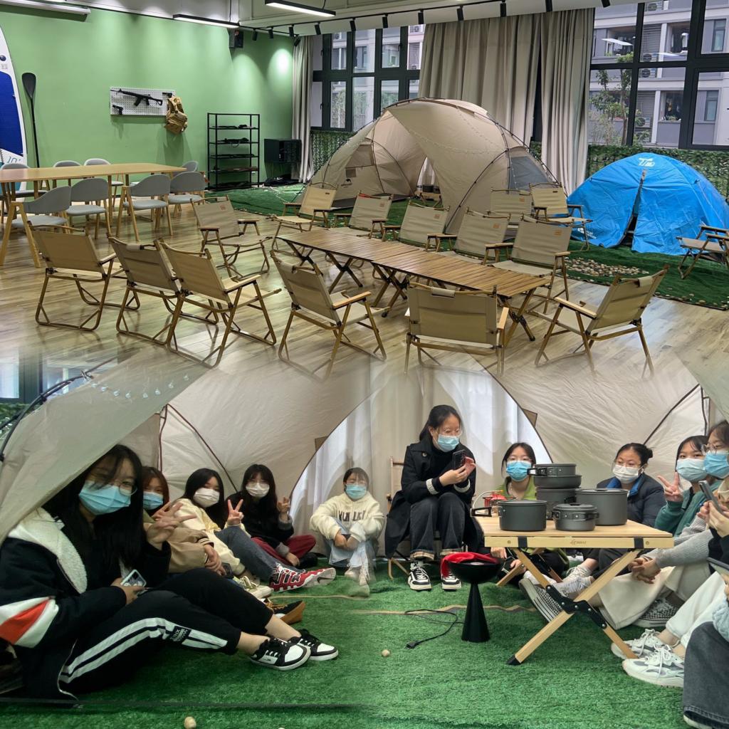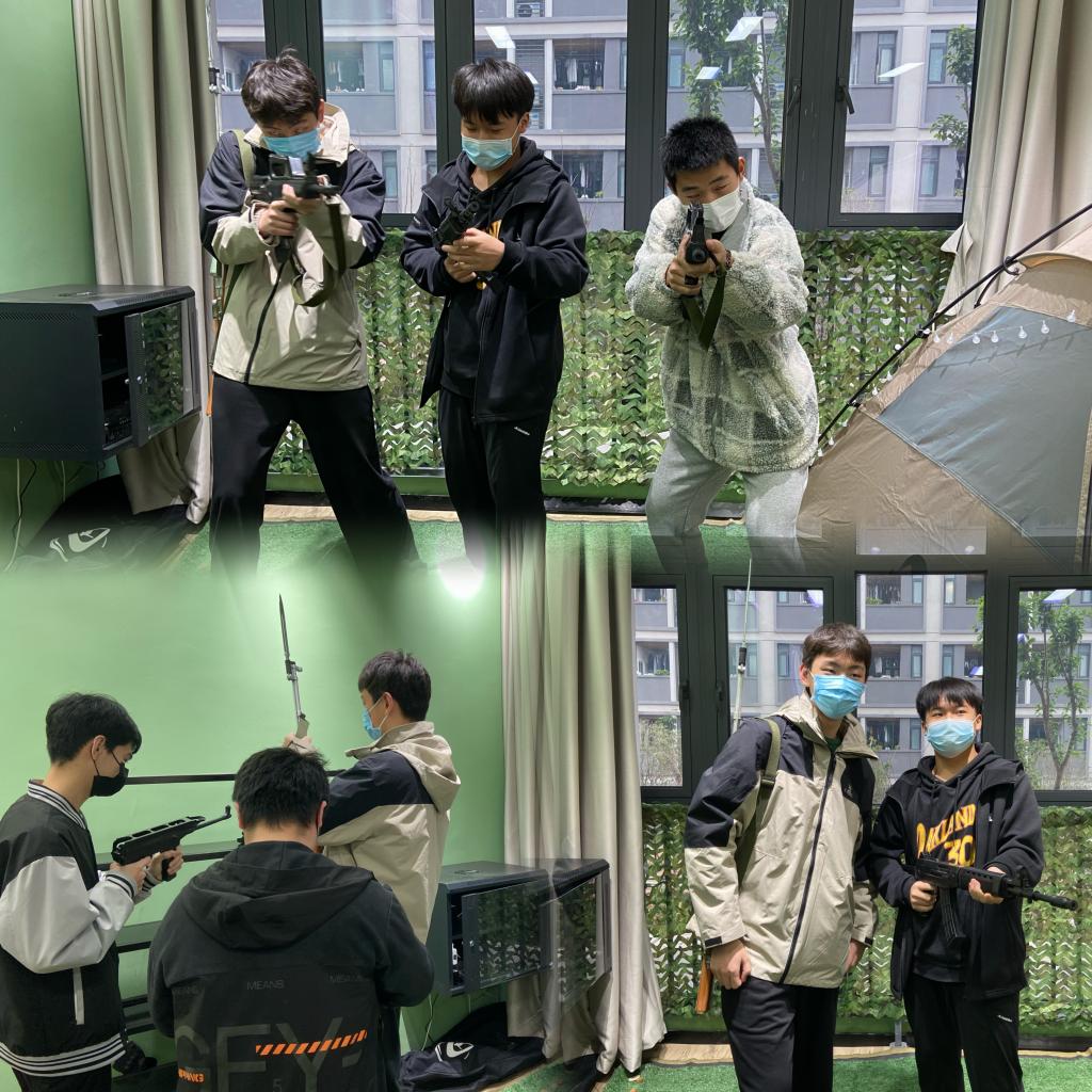 走进营地文化活动室,偌大的帐篷和经典的营地餐具吸引女孩子们纷纷上前体验,她们或是靠在舒服的克米特折叠椅上休息,或是围坐在帐篷内放肆嗨聊;男孩子们则在炫酷的军事装备前久久挪不开脚步,他们小心翼翼地拿着各种模型对着镜头各种摆酷,对初次来到营地活动室的他们来说,这里就像一个小天地,每个人脸上都写满了新奇,更对即将开始的冰壶挑战充满了期待。