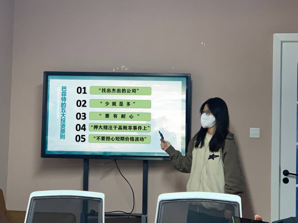 随着阅读分享会的进程推动,我们也进入了尾声,每个同学都积极发言,谈及自己的心得体会:“转变一下思维,可能就是成功的方法”。通过品味这本书掌握巴菲特成功的秘诀,提高我们的思维能力,开拓我们的眼界,提升我们的综合素质,让我们能够正确规划未来,直面挑战。
