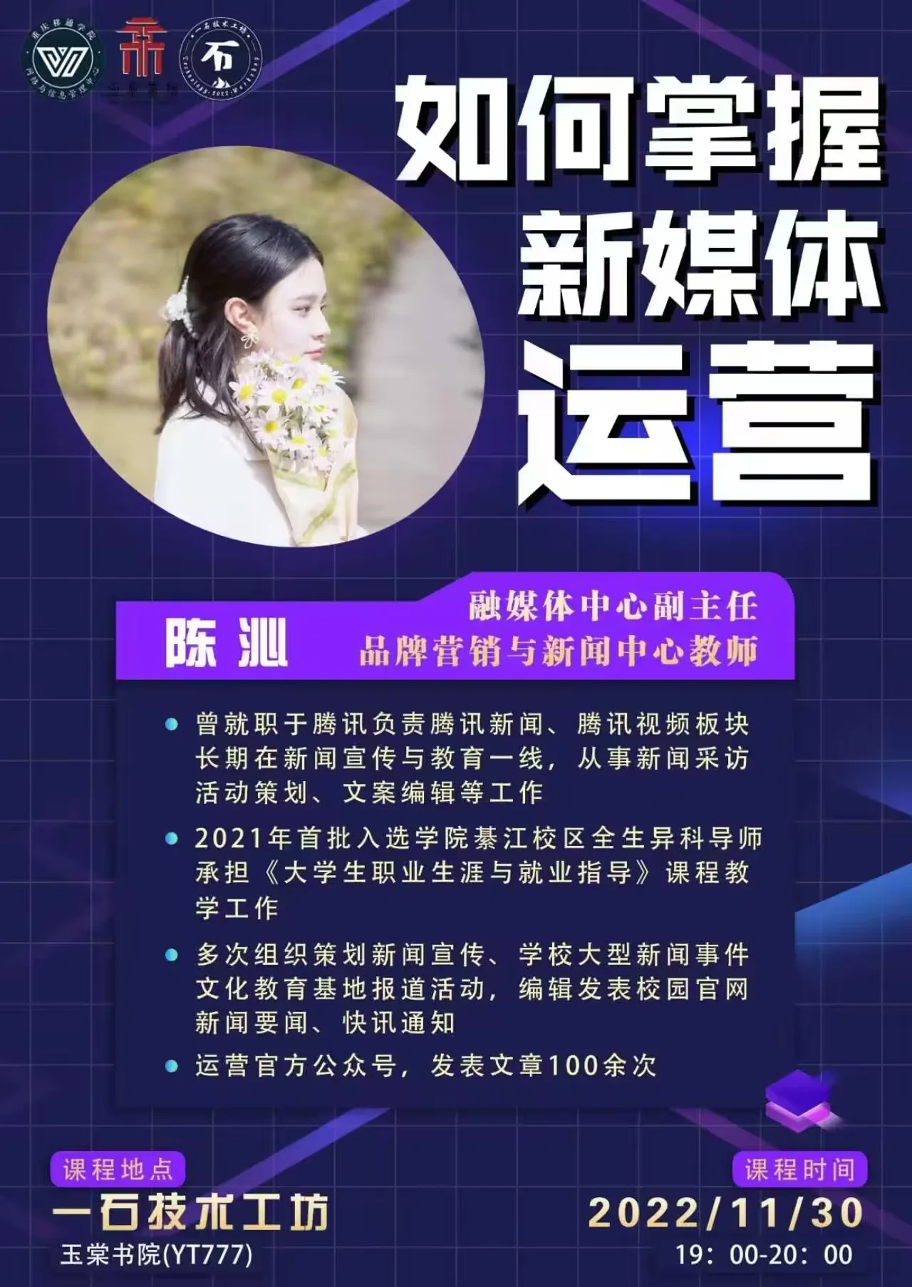 本次分享会由一石技术工坊承办,特邀融媒体中心副主任陈沁老师作为主讲人就如何正确掌握新媒体运营的要点,进行了本次活动的分享。