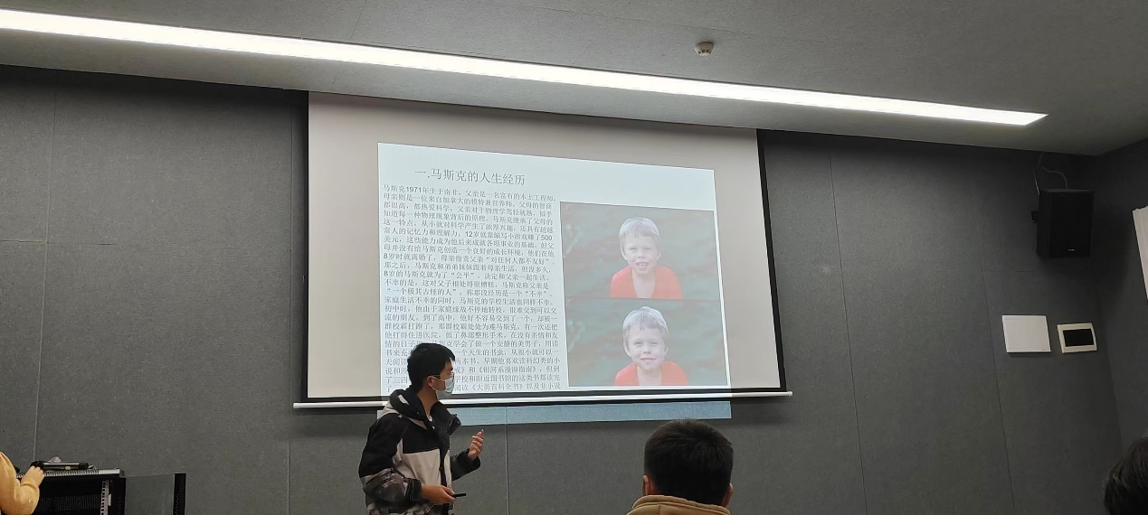 电影观看完后,计算机科学与技术11班的秦坤同学通过PPT展示对《硅谷钢铁侠:埃隆·马斯克的冒险人生》这本书进行了详细介绍。讲述了埃隆·马斯克在重重困境中坚守自己的理想成功将“龙飞船”发射到地球轨道。随后秦坤同学也阐述了自己看完整本书的心得:回顾其发展史,埃隆·马斯克充分发挥了自己不断创新的精神,乐观并敢于尝试和冒险,从而获得了更大的机会。正是因为具有这样的精神,才造就埃隆·马斯克的辉煌成果,开创了商业化航天事业。
