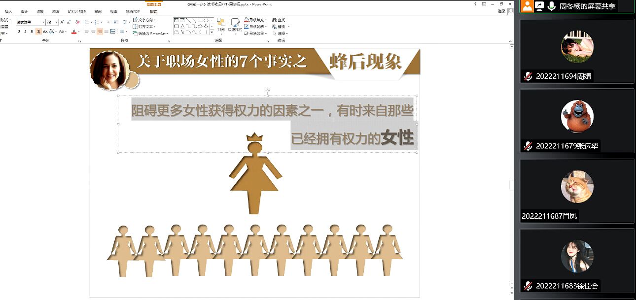 周老师首先结合谢丽尔·桑德伯格在《向前一步》中提出的关于职场女性晋升、高层性别比、自我评价、成功归因、蜂后现象、家庭分工、受欢迎度7个事实开始与同学们进行分享,并着重向同学们讲述了关于职场女性的7个事实之蜂后现象这一板块。此时此刻,同学们的注意力达到高度集中,纷纷开始思考到底该如何去缓解这一现象啊!
