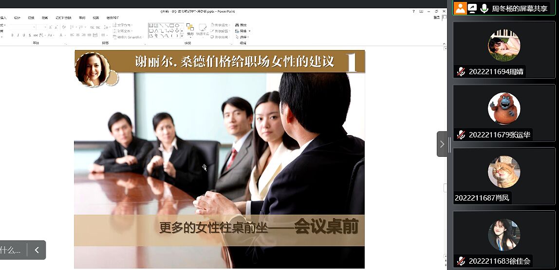 随后,周老师也是针对同学们的问题围绕谢丽尔·桑德伯格给职场女性的八条建议一一向同学们进行讲解。其中,周老师更是对第一条建议“往桌前坐才有机会”与同学们进行了深层次的交流,与此同时还给予了同学们一些学习生活上的建议。