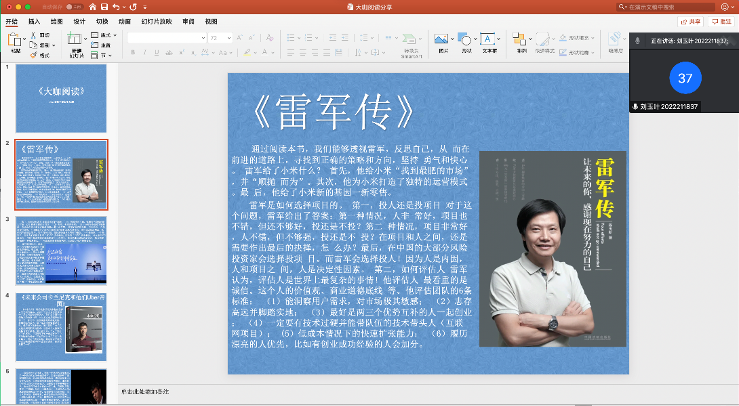 即使是在线上交流,但仍阻挡不了同学们对于阅读的热爱,在会议中,同学们通过自己所制作的PPT侃侃而谈,充分地展示了自身对于大咖阅读书籍的心得以及看法,并且在会议中同学们也热烈的进行了讨论,实现了知识的交流互鉴,余金凤老师也对于会议的热烈氛围给予鼓励与赞赏。