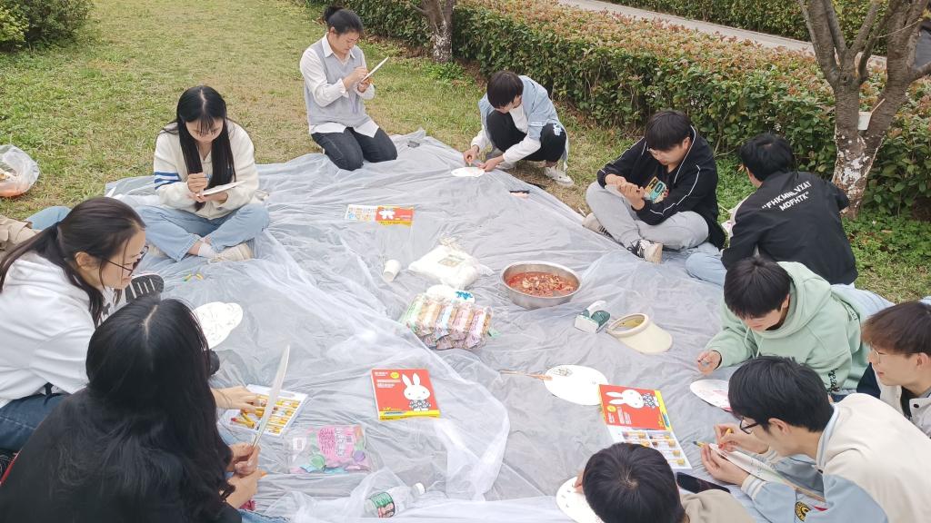 绿草是春天的象征,绿意盎然使人心情豁达,此行的第一件事便是拥抱盛开的鲜花和遍地的绿草。随着一张张白色野餐布的铺开,也代表着赏花之行的正式开始。拿出、撕开、撑起,一气呵成,在大家的默契配合下,现场布置工作也能轻易拿捏。完成布置不易,张老师也为大家准备了一点小惊喜,深受大家喜爱。