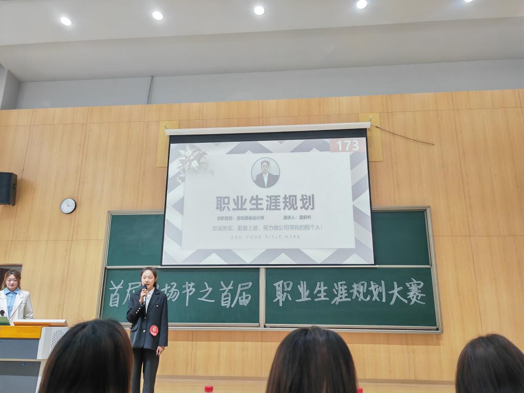 2023年3月17日下午2点30分,重庆移通学院首届职场节之首届职业生涯规划大赛决赛在玉棠书院阶梯教室顺利举行。来自各个学院的12名选手进入决赛,经过两个小时的角逐,由异科导师陈有梅担任指导老师的大数据与计算机科学学院2022级虚拟现实技术1班雷舒吟同学,在决赛中稳定发挥,获得了第三名的好成绩。