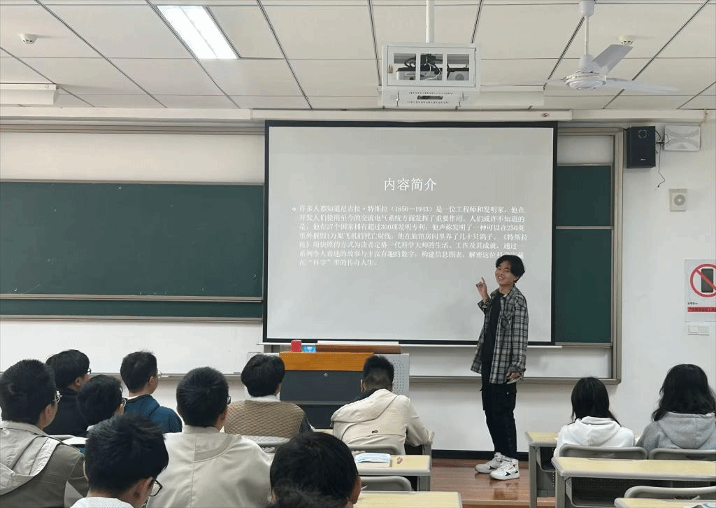 接下来,周祥宇同学上台向大家阐述了自己阅读之后的感受和理解。通过两位老师以及周祥宇同学的分享,使在场的很多同学对特斯拉以及他的发明感到惊奇与崇敬,大家感叹这位100多年前的怪人,竟能在那个年代提出如此多超前的发明想法,更有同学甚至直接喊出了“致敬尼古拉·特斯拉”的口号。
