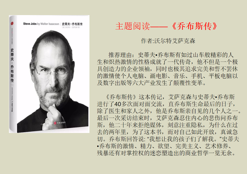 然后,他从主题阅读的角度分享了《乔布斯传》,《乔布斯传》向外界展示了一个真实的乔布斯,和他光鲜耀眼的成功相比,他经厉过坎坷,成功也并不是一帆凤顺,面对挫折,他亳不畏惧,在内心深处的理想引领下,坚持把每一天都当成生命的最后一天来战斗,在工作中充满了激情和创意,正是这个复杂的人,最终成就了非凡的苹果,创造出个人电脑、动画电影、音乐、手机、平板电脑以及数字出版等六大产业的颠覆性变革。