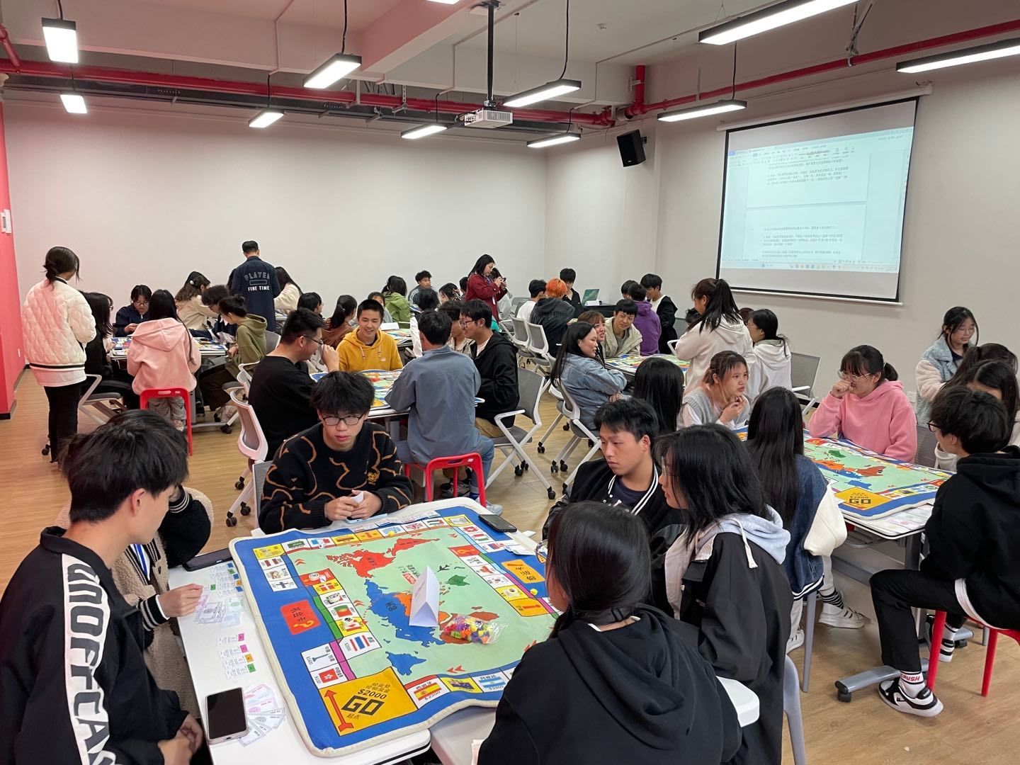 首先主持人公布了此次游戏玩法的一些小改变,游戏的玩法设定更加贴合创业的主题,像一个简易版的创业生涯。我们的这个游戏规则的特点在于可以让玩家在沉浸式游戏中了解到一些创新创业的知识,所以我们将机会与命运板块的规则做了一些调整,在走到机会时我们是可以雇佣一位员工去为自己打工赚钱,走到命运时,我们现场工作人员会提问题,所有的问题都是一些创新创业方面的问题,这两个改变也让这个游戏更加贴合就业创业主题,最后再由银行进行清点总财产。工作人员们耐心为玩家们讲解游戏规则,介绍玩家创业故事线,大家如实记录投资收益。工作人员们的辛勤付出和大家的默契配合让大富翁活动有条不紊的进行。