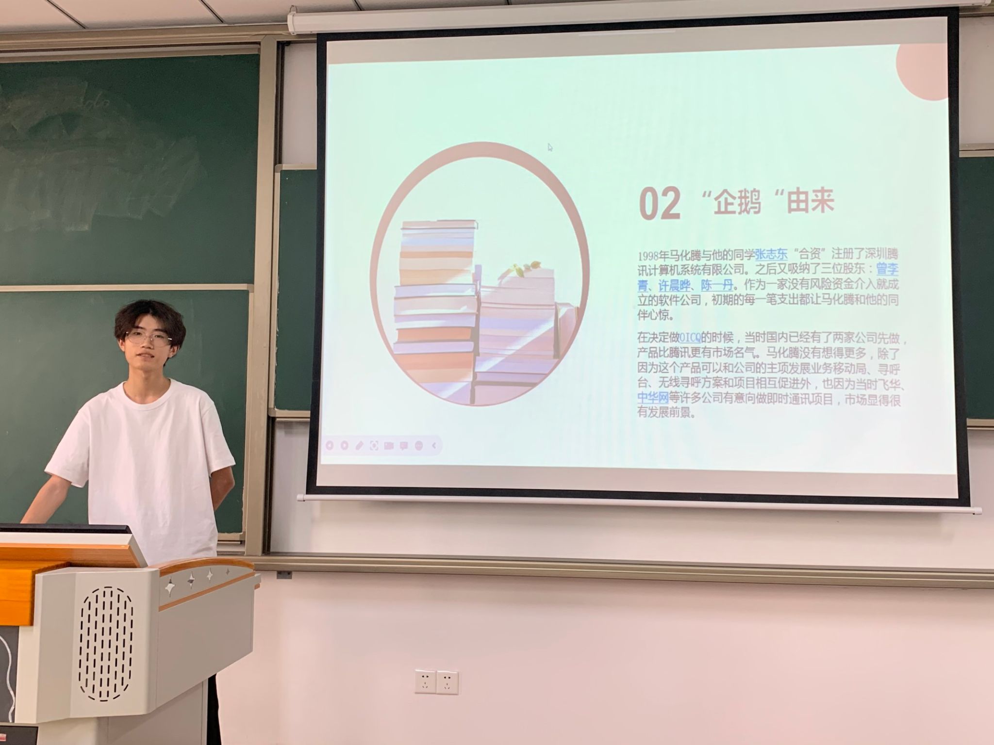 卿永浪同学首先向同学们提出问题——腾讯是如何成长起来的呢?接着他从腾讯的使命和口号等角度来解答这个问题。他说,腾讯的使命是让互联网更美好,也是腾讯企业文化的核心价值观之一,就是“用户至上”腾讯的口号是“用户为本,科技向善”。在这一点上,马化腾非常重视用户,也很重视用户的体验。在移动互联网时代,腾讯依然坚持“用户为本,科技向善”的理念。他说:“用户为本,是以用户为中心;科技向善,是用科技为社会创造价值。
