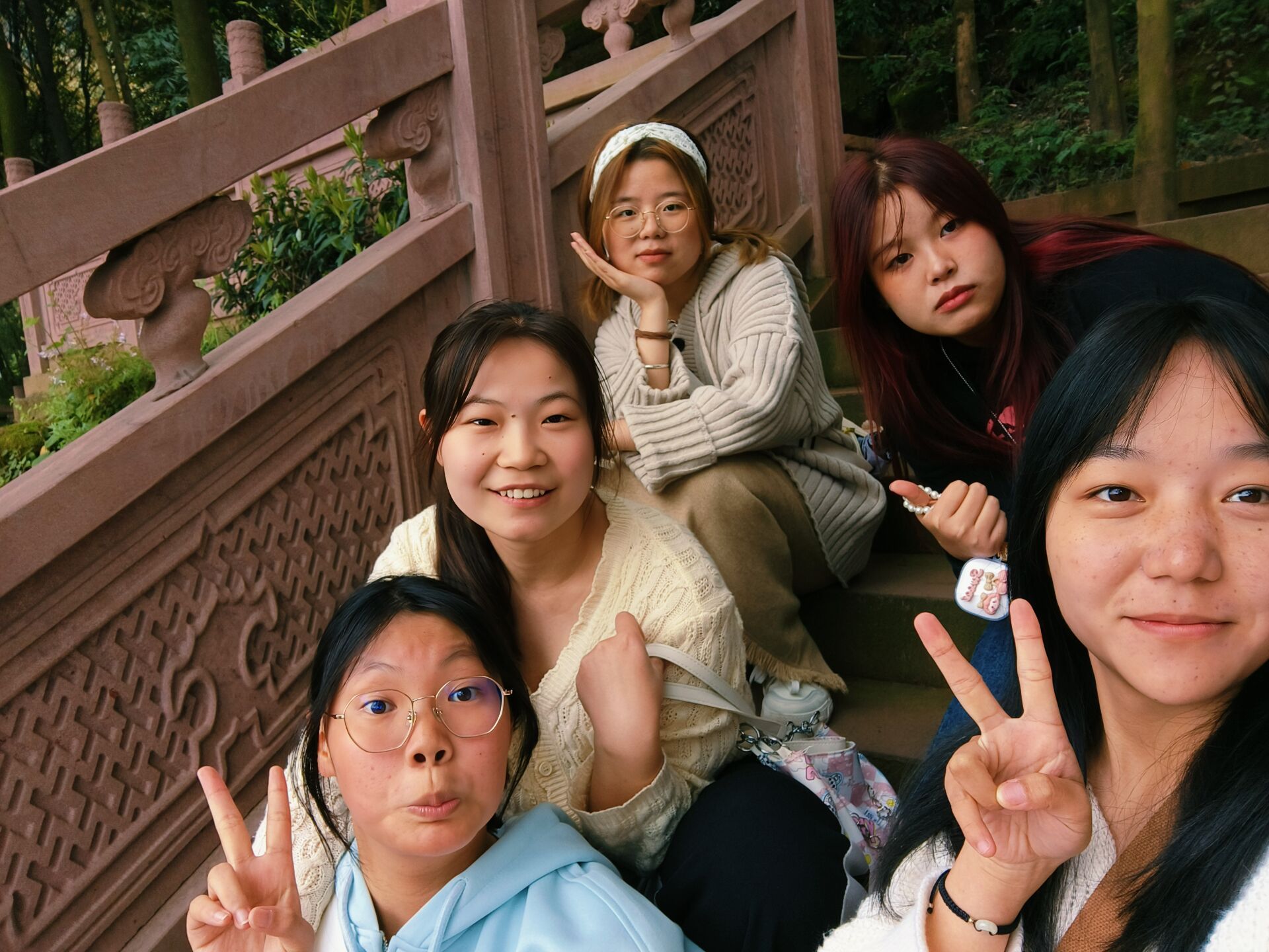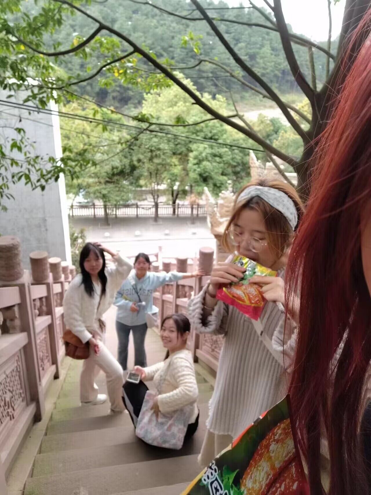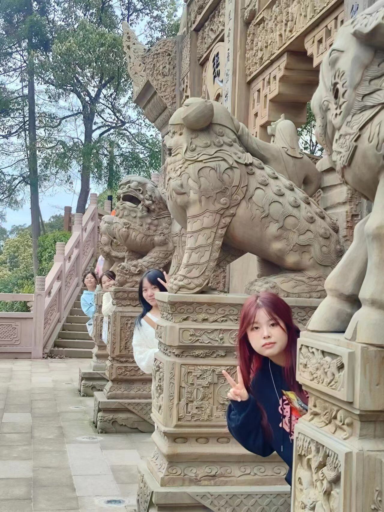 首先我们一行人乘坐公交车踏往古剑山。山路蜿蜒曲折,一路向上,我们的心更加澎湃,期待着山上的风景,爬山带来的喜悦。然而令大家惊讶的是,公交车直接把我们带到了山上,在寺庙旁侧,原本以为我们的爬山就要这样草草结束,但其他游客却呼喊着向上爬,这时我们才反应过来,原来距离山顶还有一段距离,而这段路更为崎岖,更为陡峭。