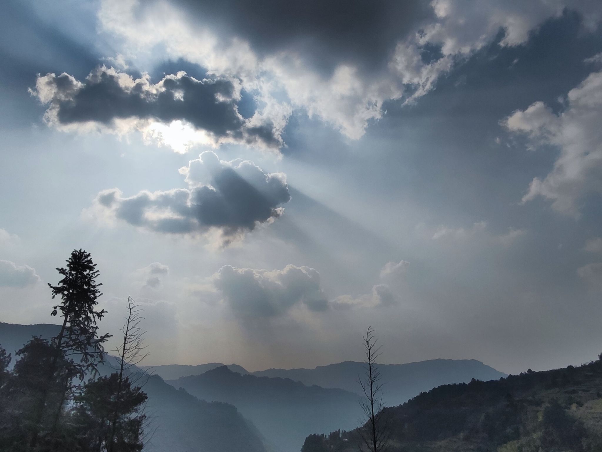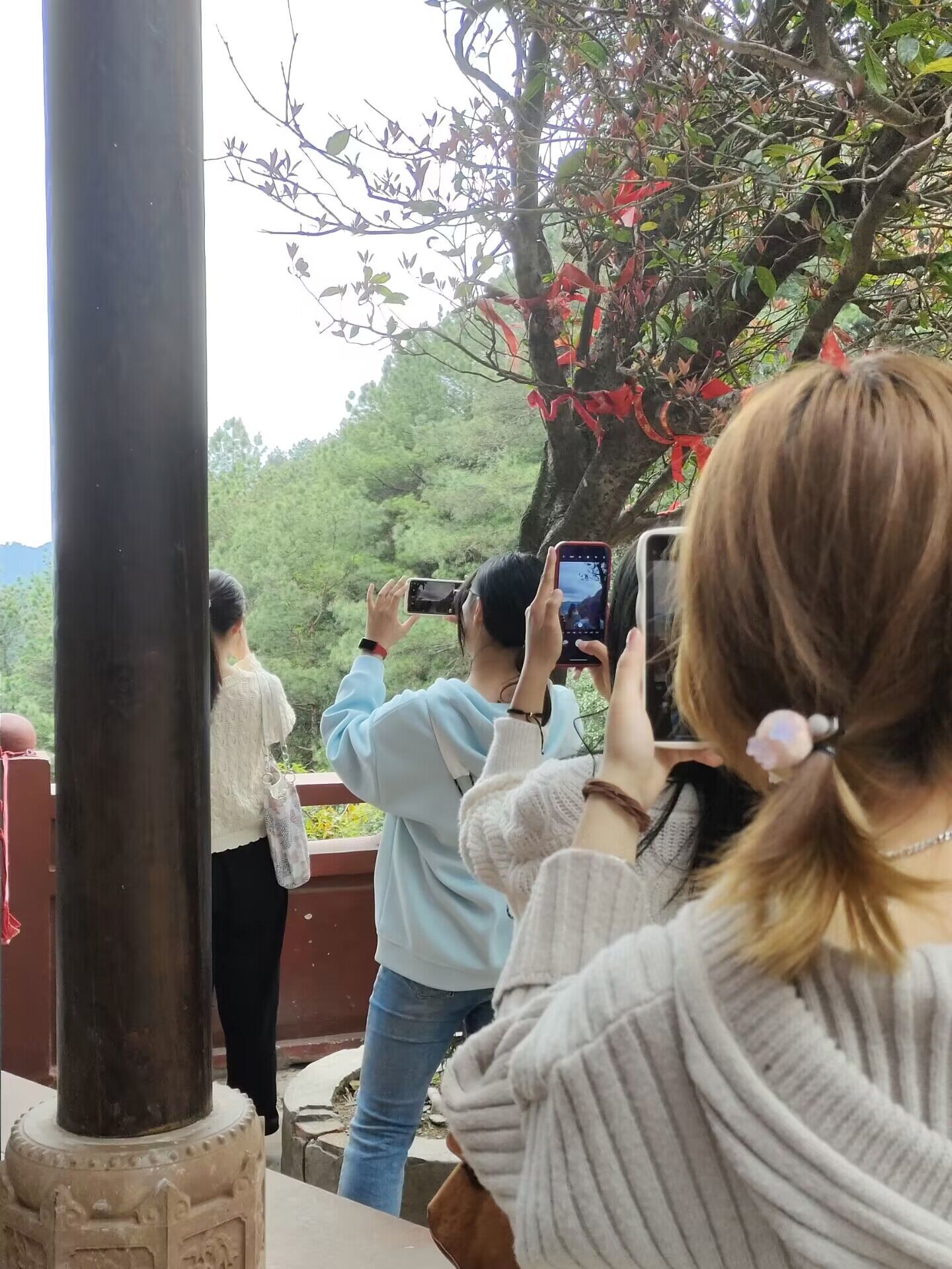 我们一路漫步,欣赏寺院周围粗壮的大树,盘盘交错的树枝,感受自然,与自然共情。我们一边唏嘘自然的鬼斧神工,一边又赞叹寺庙的雕阑玉砌。我们情不自禁的拍下这里美丽的风景留作纪念,越往上爬,阶梯也逐渐增加,高度逐渐增高,人群逐渐增加,来来回回。室友们渐渐体力不支,攀附着栏杆,一步一步向上走。终于我们来到了顶峰,站在巍峨的云峰上,霎时峭壁生辉,转眼间,脚下山林云消雾散,满山苍翠,掩映着雕檐玲珑的古代建筑群,顿时心旷神怡。