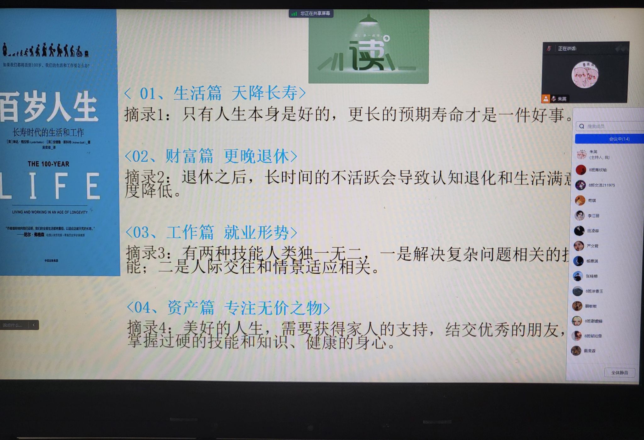然后,活动正式开始。朱老师为同学们介绍了由经济学家琳达·格拉顿和心理学家安德鲁·斯科特共同撰写的与社会认知和人生规划有关的书籍《百岁人生,长寿时代的生活和工作》。该书总共包括10个篇章,分别从生活、财富、工作、资产、金钱、自我探索、私生活等多个方面、多个维度对长寿时代我们可能会面对的各种情境和挑战做了描述,同时朱老师也为同学们提供了一些生活和学习上的建议。