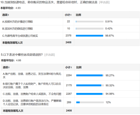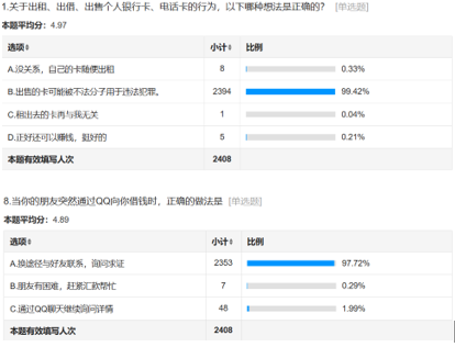 大数据学院精心设置了反诈问卷答题的测试题题目,共设计判断题、单选题、多选题三个类型,涵盖了多种常见的诈骗知识以及诈骗手段。测试的题目也是旨在帮助同学们提高对迷惑性强、诱惑性大诈骗的甄别能力,较好地去分辨AI高科技诈骗、新型隐蔽诈骗和帮信罪等新形式、新手段。在答题过程中,辅导员们分层分类开展,通过线上年级会、班群加强宣传动员,辅导员、学生组织、班委带头答题,全院学生都进行了1次反诈测试。